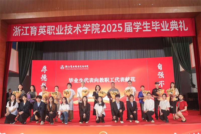 毕业生代表向教职工代表、家长代表、企业代表献花。