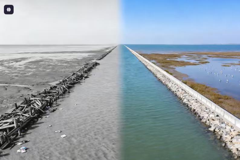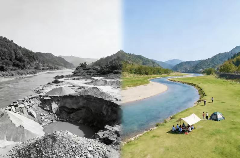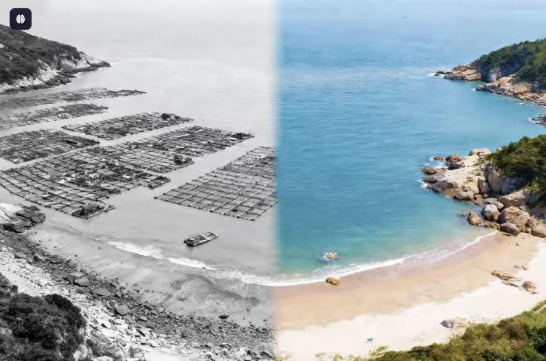 本届比赛延续本科组与高职组同台竞技的赛制,以“浙山浙水”为主题,聚焦“绿水青山就是金山银山”理念提出二十周年的生态实践。戚琉婷作品将人工智能设计技术与大赛主旨深度融合,以“时空对话”为叙事主线,通过分屏对比的视觉语言,生动呈现了浙江省六大代表性地理坐标的生态修复历程。从钱塘江的“江海安澜”到舟山群岛的“生态海湾”,以严谨的史料考证为基础,运用人工智能软件图像生成功能,将昔日的环境创伤与今日的绿色生机并置,深刻诠释了“从生态伤痕到生态财富”的转型之路,展示了扎实的专业技能与创新的设计理念。