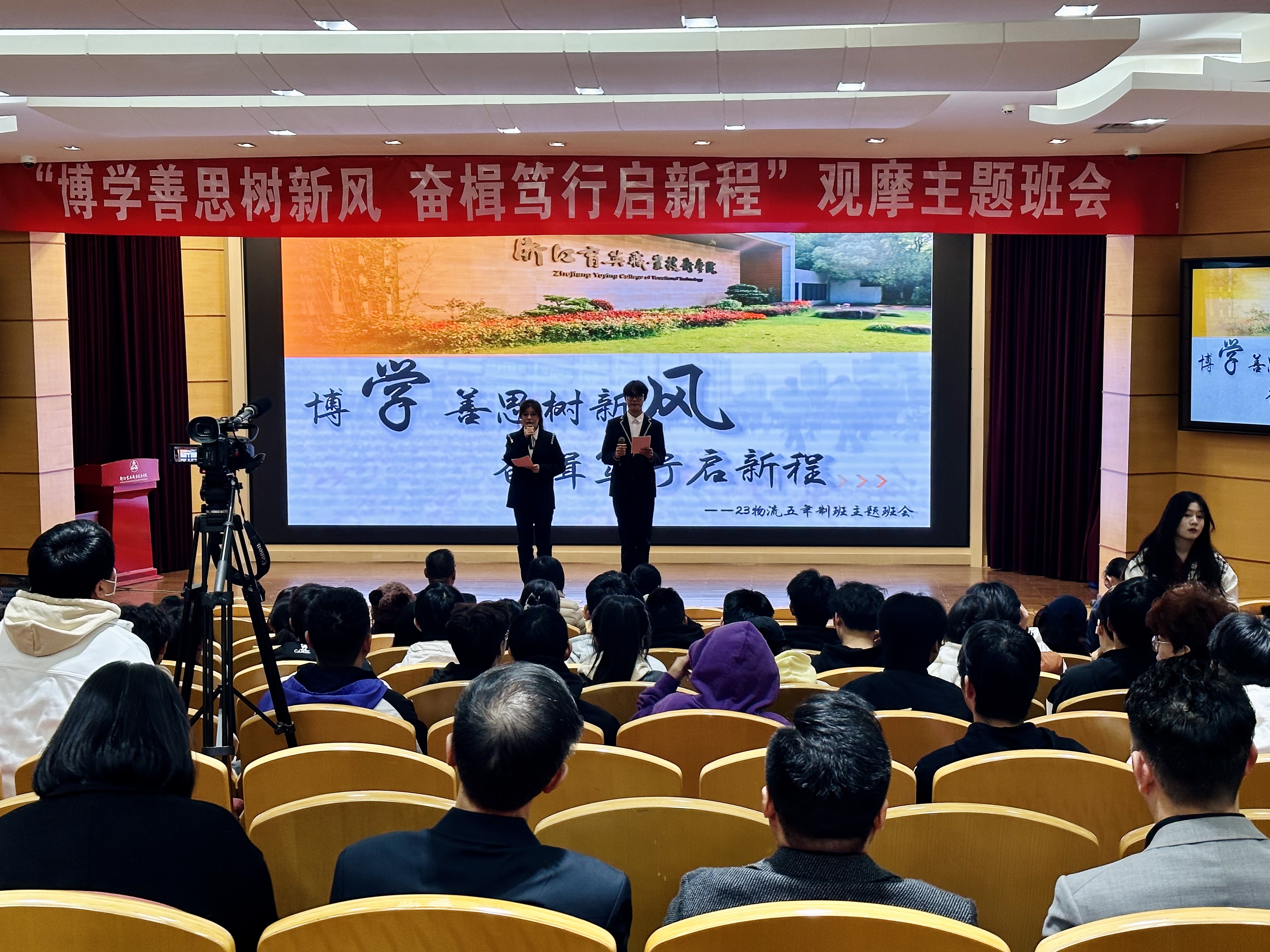 2023年11月24日上午9:00, 23物流五年制班在学术报告厅召开“博学善思树新风,奋笃行启新程”观摩主题班会。质管部主任张中新、学务部主任邬佳、副主任王亦飞、学生事务中心主任韩萍等老师担任此次班会的评委。