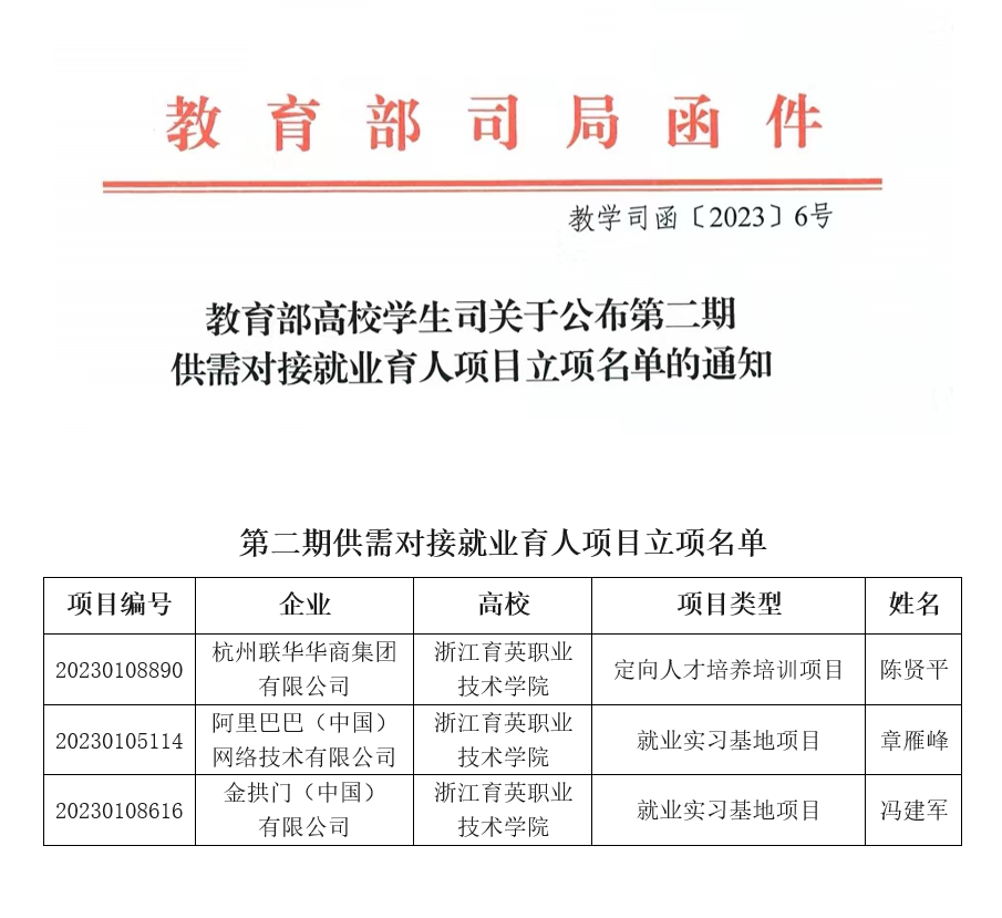 近日,教育部高校学生司印发《关于公布第二期供需对接就业育人项目立项名单的通知》(教学司函〔2023〕6号),数字商贸学院与3家企业联合申报的3个项目获立项,其中包含定向人才培养培训项目1项,就业实习基地项目2项。