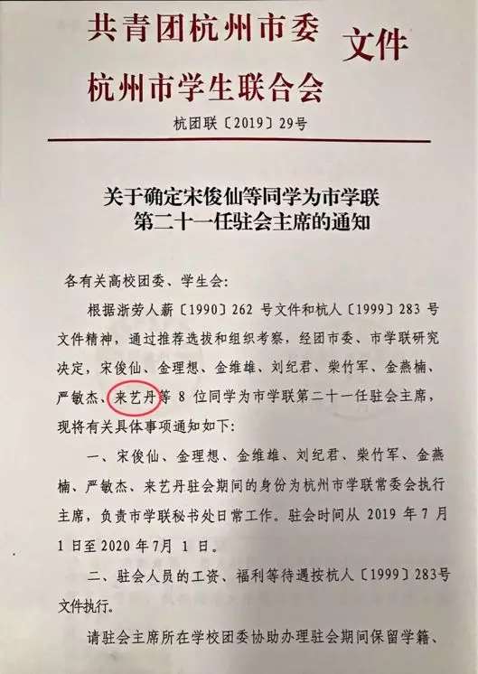 近日从《关于确定八位同学为市学联第二十一任驻会主席的通知》(杭团联〔2019〕29号)文件获悉,我院学生会副主席来艺丹同学经过团市委、市学联组织的笔试、面试及后期考察等环节,从各高校候选人中脱颖而出,成为唯一一个专科院校学生与来自杭州师范大学等院校的8位同学一起被任命为杭州市学生联合会驻会执行主席,任期一年,这是近年来我院第六位当选市学联驻会执行主席的学生干部。