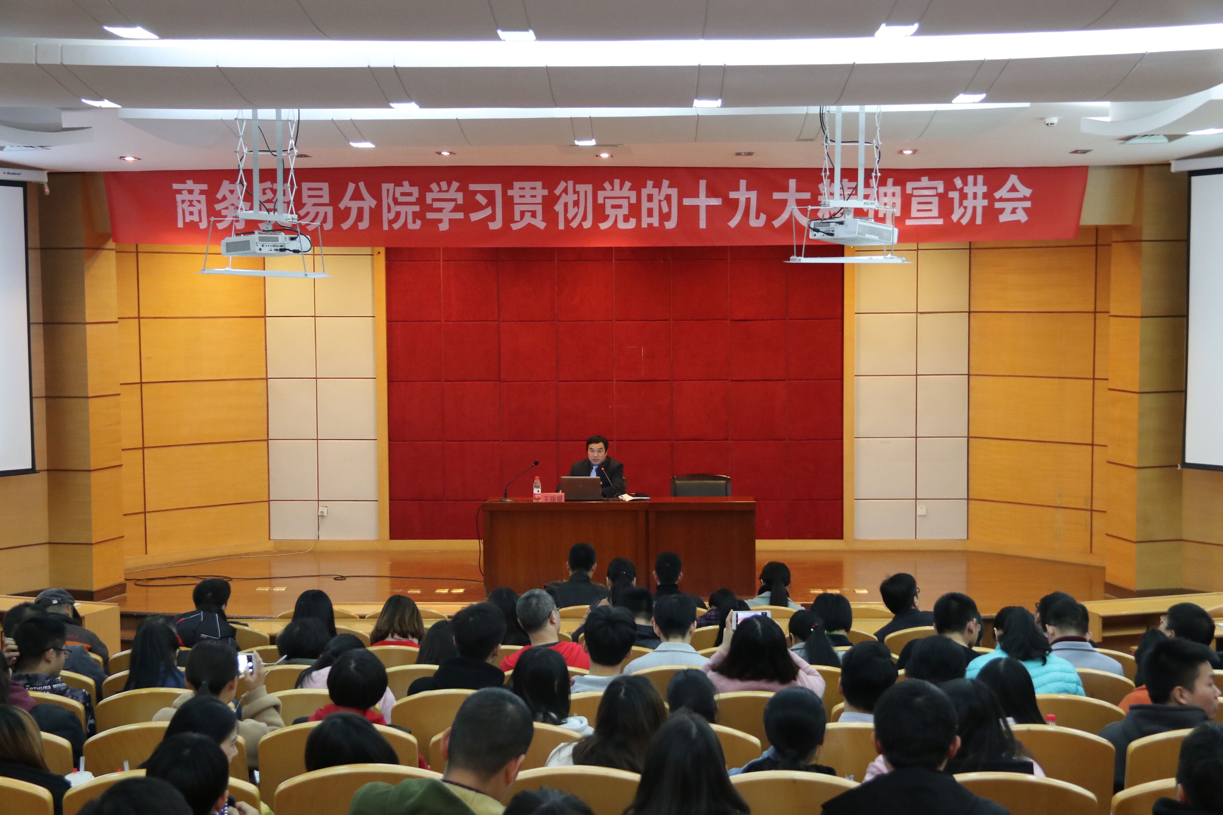 2017年11月24日中午,商务贸易分院学习贯彻党的十九大精神宣讲会在学院综合楼学术报告厅举行,宣讲会由学院党委王锡耀书记主讲,分院全体教师、教师、学生党员和班级代表参加了学习,分院王贤军书记主持。