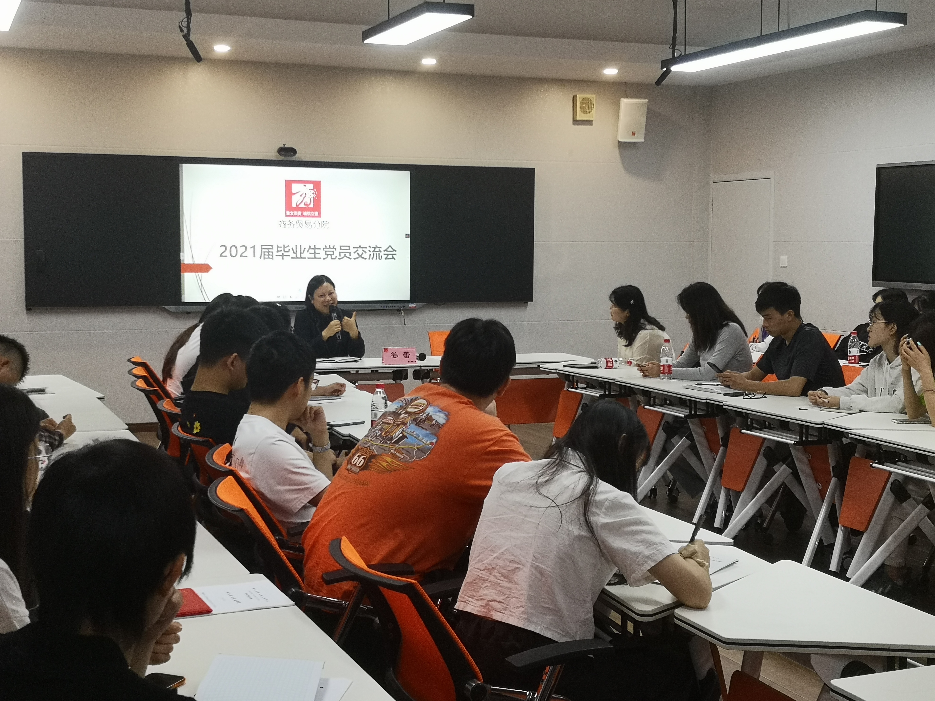 2021年5月18日下午14:30,商务贸易分院党总支在三号教学楼3213智慧教室举行了毕业班党员交流会,分院党总支书记姜蕾、组织员冯建军以“学史力行忆初心,扬帆起航踏征程”为题,与分院2021届58名毕业班党员进行了学习交流。