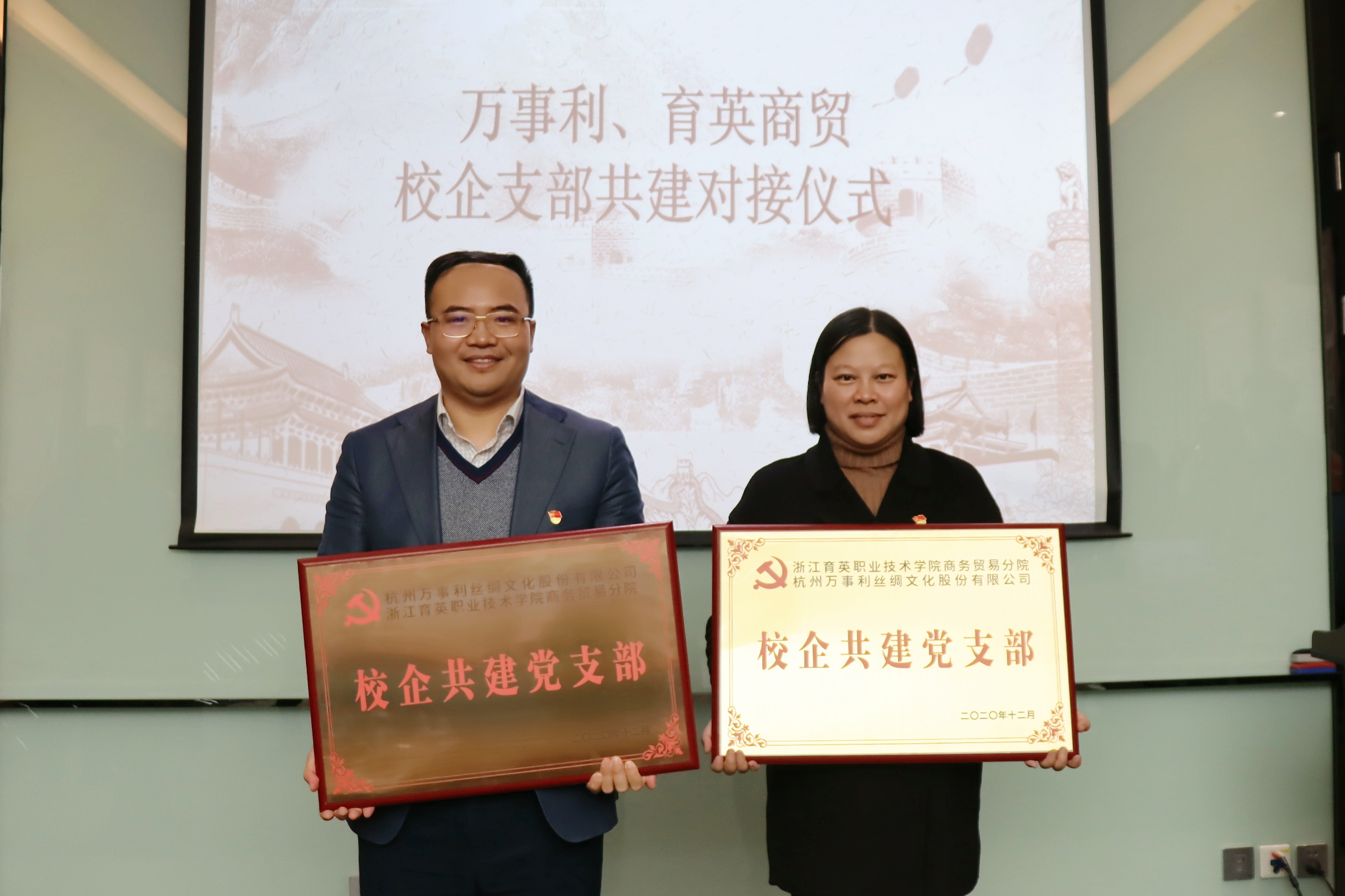 2020年12月4日下午,商贸分院全体教师党员集体前往杭州万事利丝绸文化股份有限公司,开展商贸分院教工党支部与万事利丝绸股份有限公司党支部的共建对接仪式。