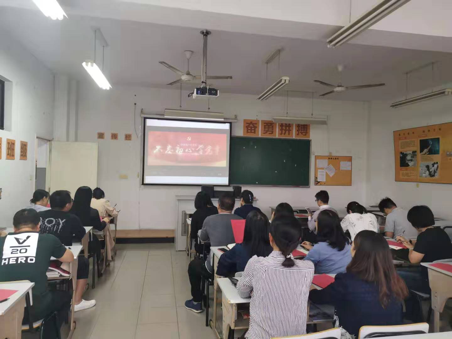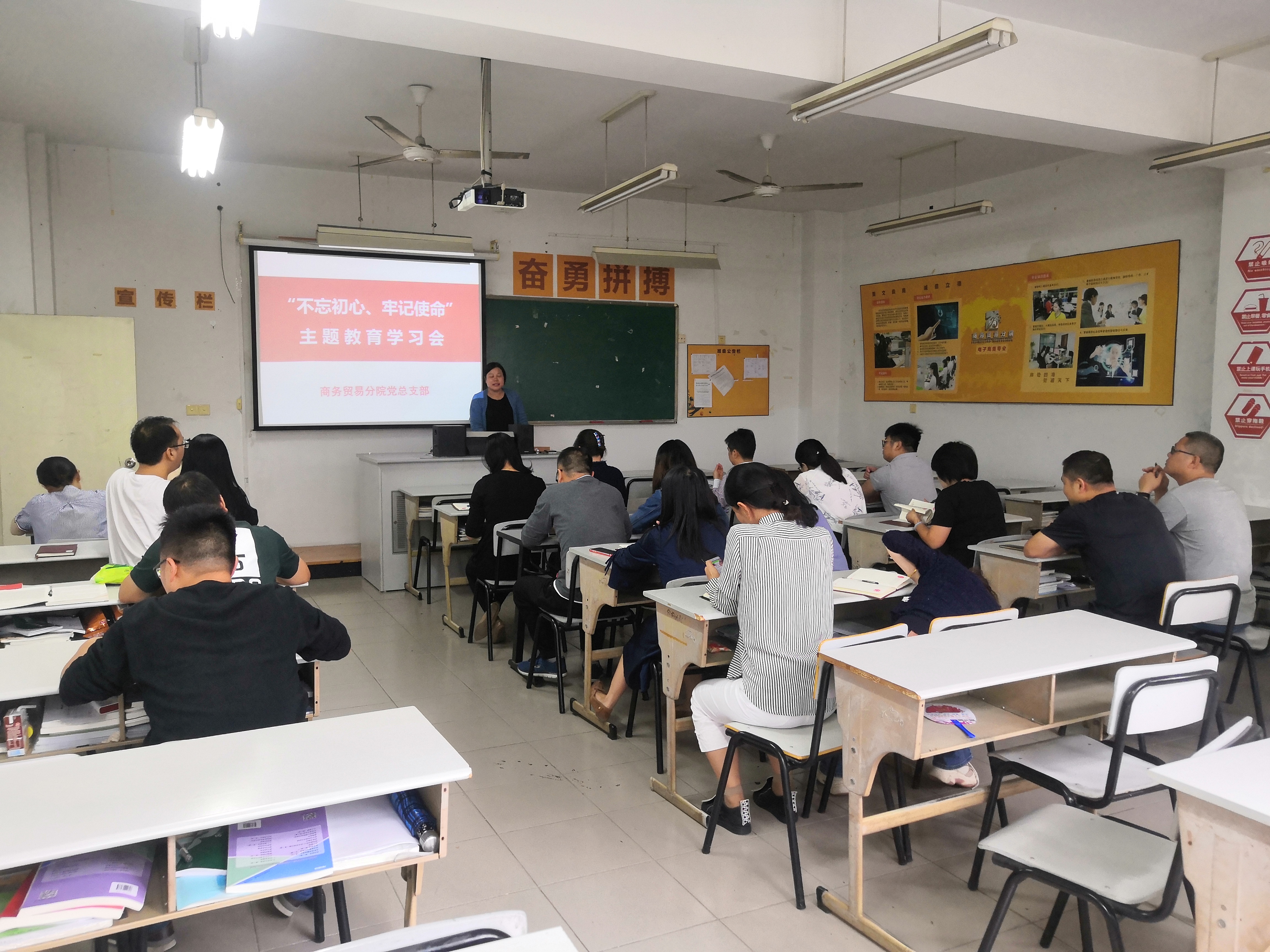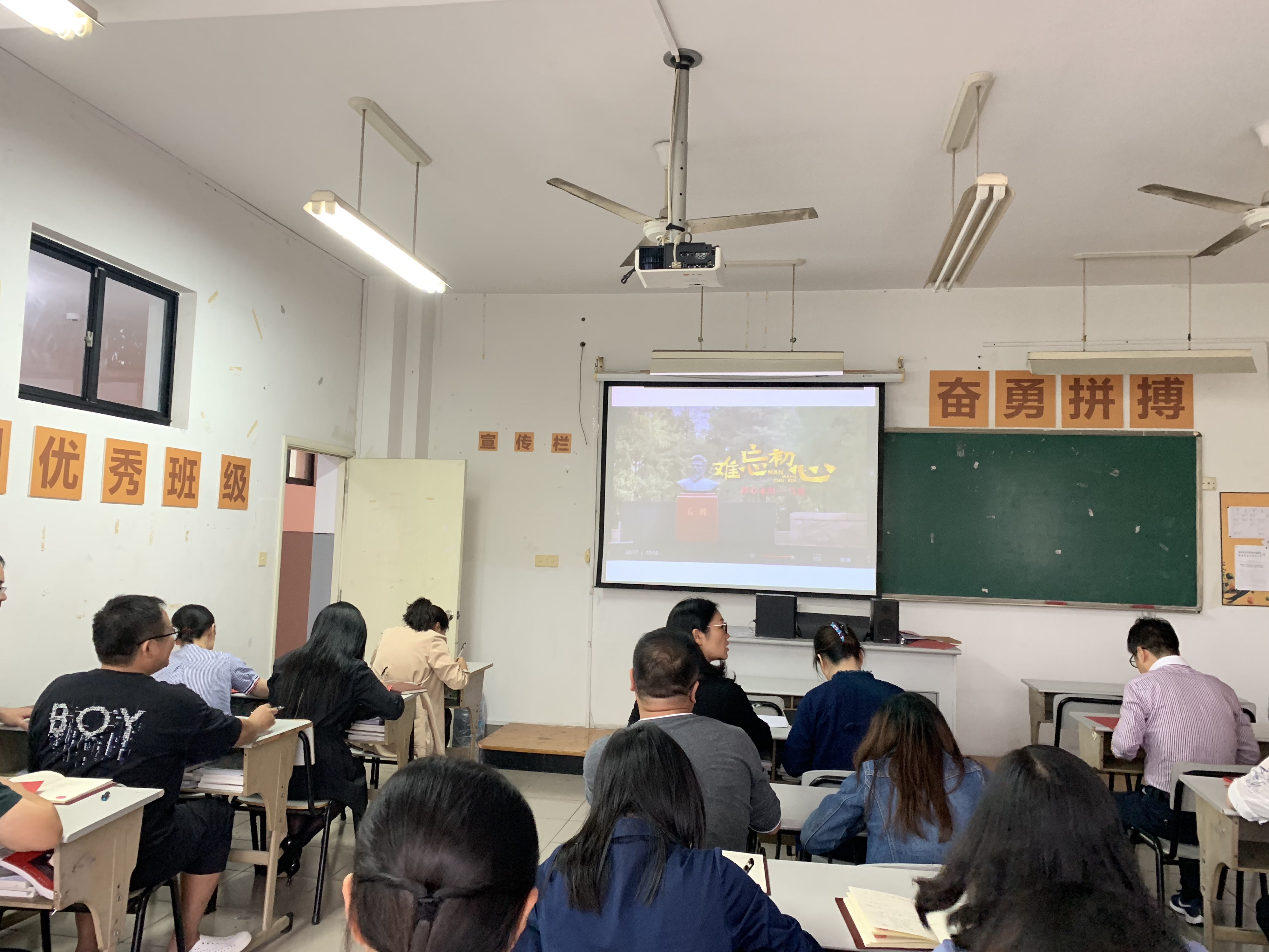 2019年10月12日中午,商贸分院党总支部在3309教室召开“不忘初心、牢记使命”主题教育学习会。分院全体教师党员参加了学习会,会上集中学习观看了《不忘初心学党章》、《难忘初心》和《学榜样践初心》三部党员教育电视。