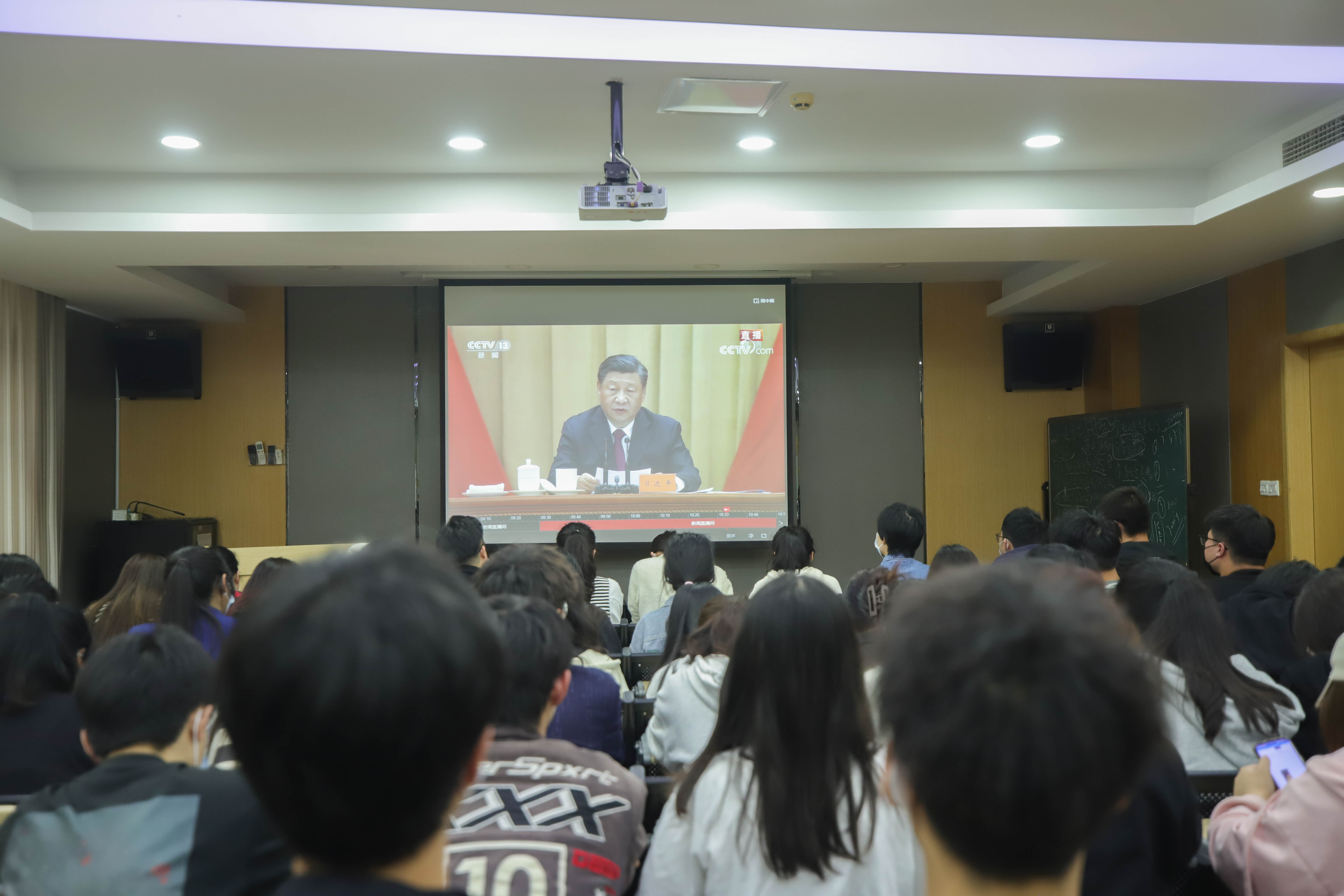 2022年5月10日上午10:00,在创意设计分院团总支组织下,创意设计分院学生干部在创意中心视听室集体观看庆祝中国共产主义青年团成立100周年大会现场直播,参加人员还有党总支书记张丹、团总支书记周亮、组织员陈姚琼,以及全体辅导员老师。