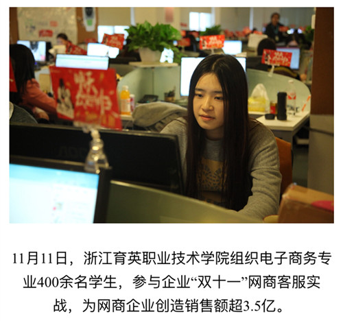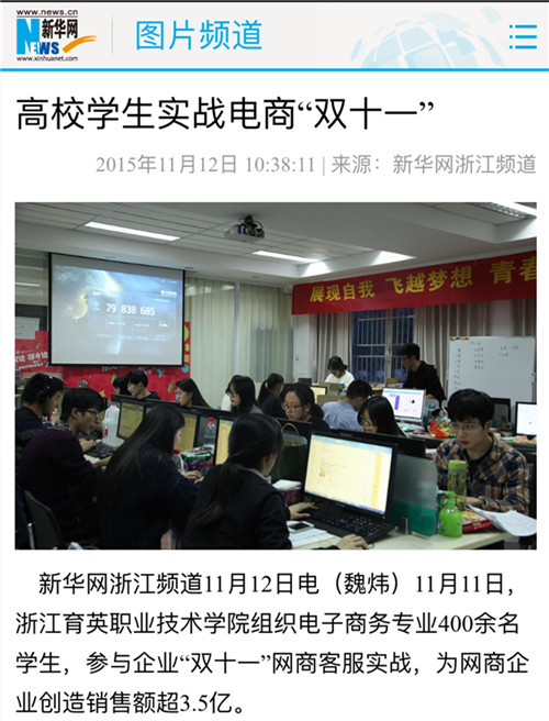 媒体看育英 联系我们 地址:杭州市钱塘区4号大街16号 邮编:310018 电话:0571-86911032、86877189 媒体看育英 当前位置:首页 >> 媒体看育英 新华网、浙江新闻报道我院学生”双十一“专题实战实训 时间:2016-03-02 11月10日-12日,我院商务贸易分院电子商务专业400余名学生参与两家电商企业“双十一”商战的客户服务工作,为企业创销售额超3.5亿元。信息技术分院计算机应用、信息管理、计算机网络专业300余名学生参与企业“双十一”网商大战的数据分析、网络维护和前台接待等工作,为三家企业创4.6亿销售额作出了贡献。新华网、浙江新闻、中国新闻图片网等媒体报道转发学院学生双十一专题实战实训。