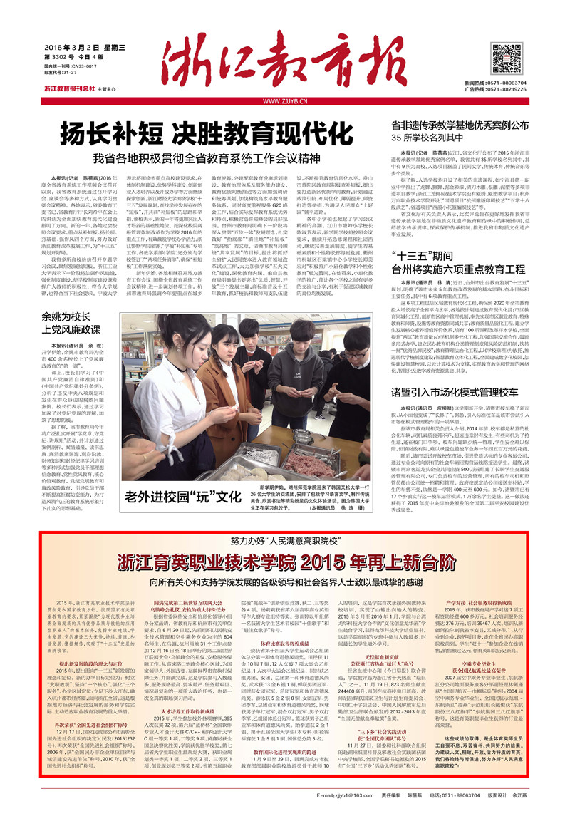 2015年,浙江育英职业技术学院坚持贯彻党和国家教育方针,按照国家有关职业教育的要求,紧紧围绕“为现代服务业培养全面发展的具有优势品质与技能的应用型职业人”的根本任务,发扬专业建设、学生发展、党的建设三大优势,持续、健康、和谐发展,捷报频传,实现了“十二五”发展的圆满收官。