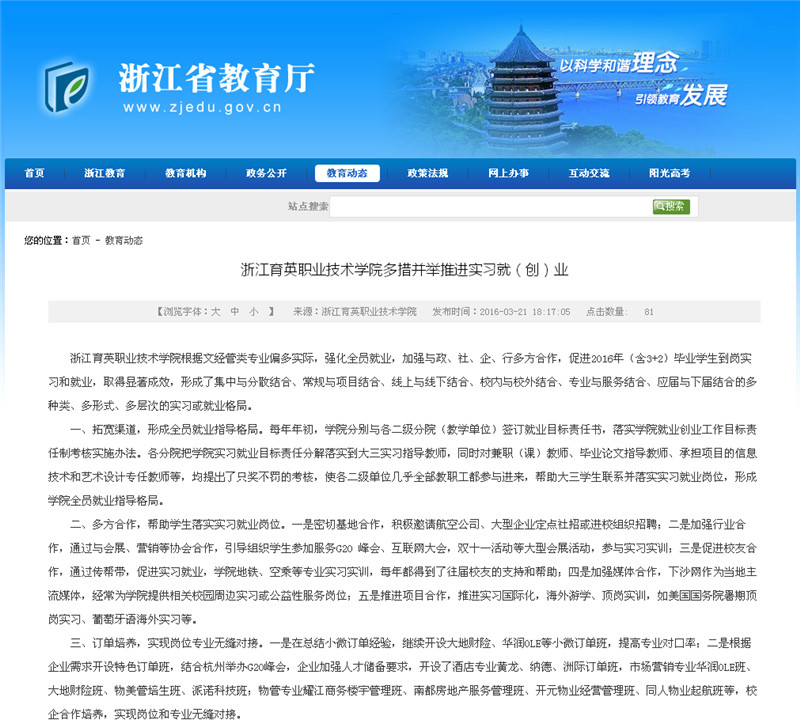 浙江育英职业技术学院根据文经管类专业偏多实际,强化全员就业,加强与政、社、企、行多方合作,促进2016年(含3+2)毕业学生到岗实习和就业,取得显著成效,形成了集中与分散结合、常规与项目结合、线上与线下结合、校内与校外结合、专业与服务结合、应届与下届结合的多种类、多形式、多层次的实习或就业格局。