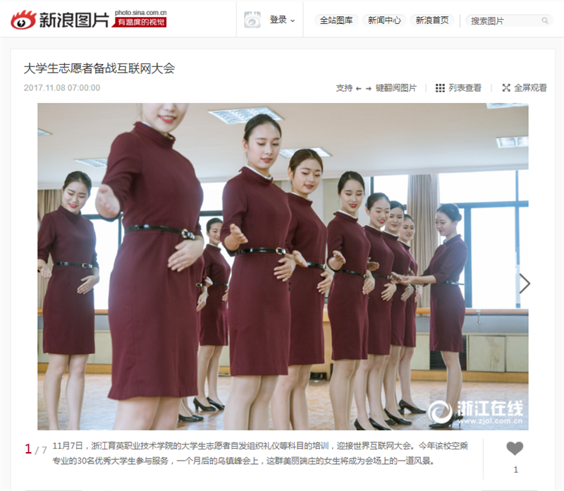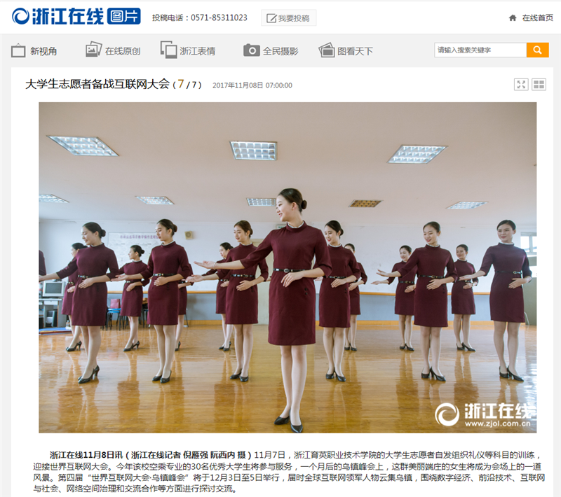 11月8日,浙江新闻客户端、浙江在线报道了我院空乘专业学生志愿者备战第四届世界互联网大会,光明网、新浪网等媒体转载。