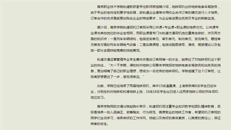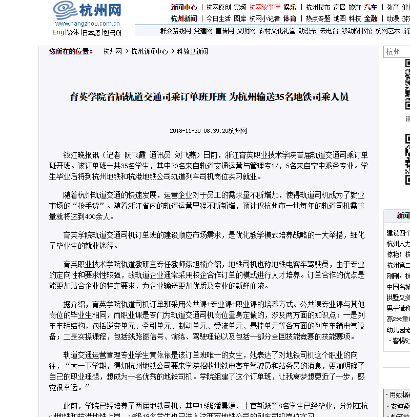 媒体看育英 联系我们 地址:杭州市钱塘区4号大街16号 邮编:310018 电话:0571-86911032、86877189 媒体看育英 当前位置:首页 >> 媒体看育英 【钱江晚报】育英学院首届轨道交通司乘订单班开班 时间:2018-11-30