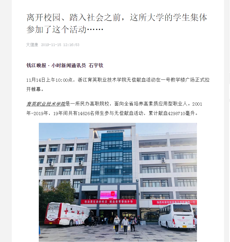 育英学院运动队的运动健将们也参与到了无偿献血中来,在刚结束的浙江省第十五届大学生大运会中,他们勇夺14金8银4铜,破11项赛会纪录,以355分的总成绩,包揽高职高专组男团冠军、女团冠军、总团冠军。他们在积极锻炼的同时,一直以来也积极参与无偿献血,以实际行动破除对献血的错误认识,展示“我健康,我献血”的理念。