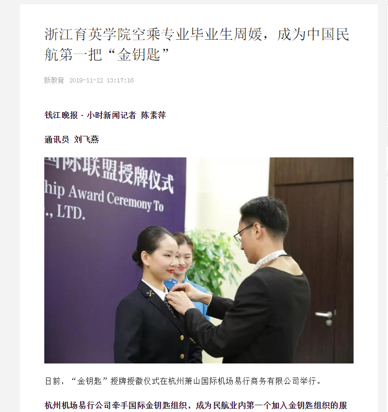 【钱江晚报】浙江育英学院空乘专业毕业生周媛,成为中国民航第一把“金钥匙”