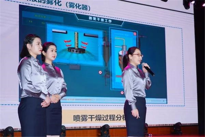 2019年11月23日-25日,2019年全国职业院校技能大赛教学能力比赛决赛在湖南化工职业技术学院闭幕。图为河南职业技术学院胡二坤团队在闭幕式上展示参赛作品《干燥蛋粉的加工》。靖鑫/摄