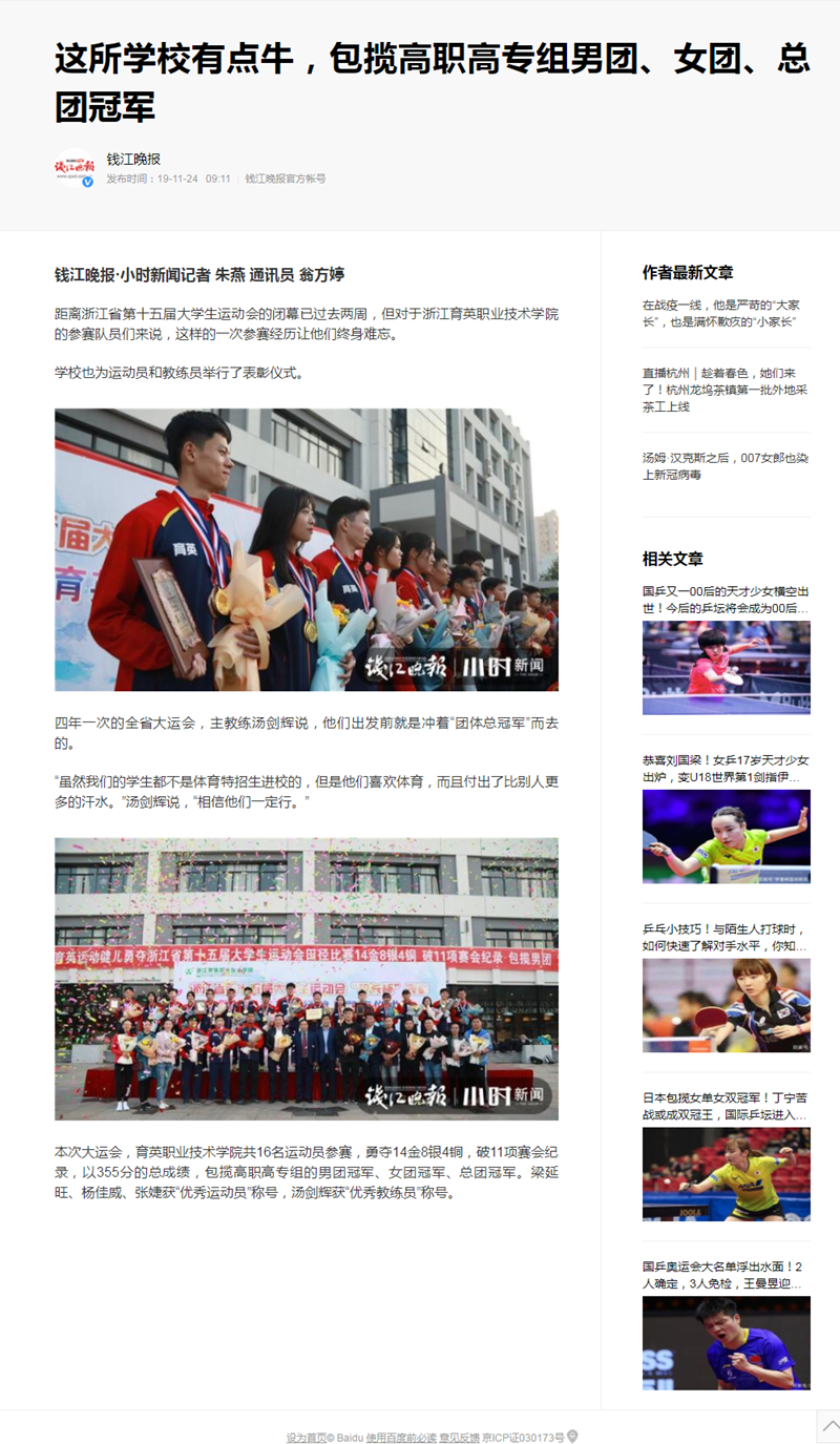 媒体看育英 联系我们 地址:杭州市钱塘区4号大街16号 邮编:310018 电话:0571-86911032、86877189 媒体看育英 当前位置:首页 >> 媒体看育英 【钱江晚报】这所学校有点牛,包揽高职高专组男团、女团、总团冠军 时间:2019-11-26