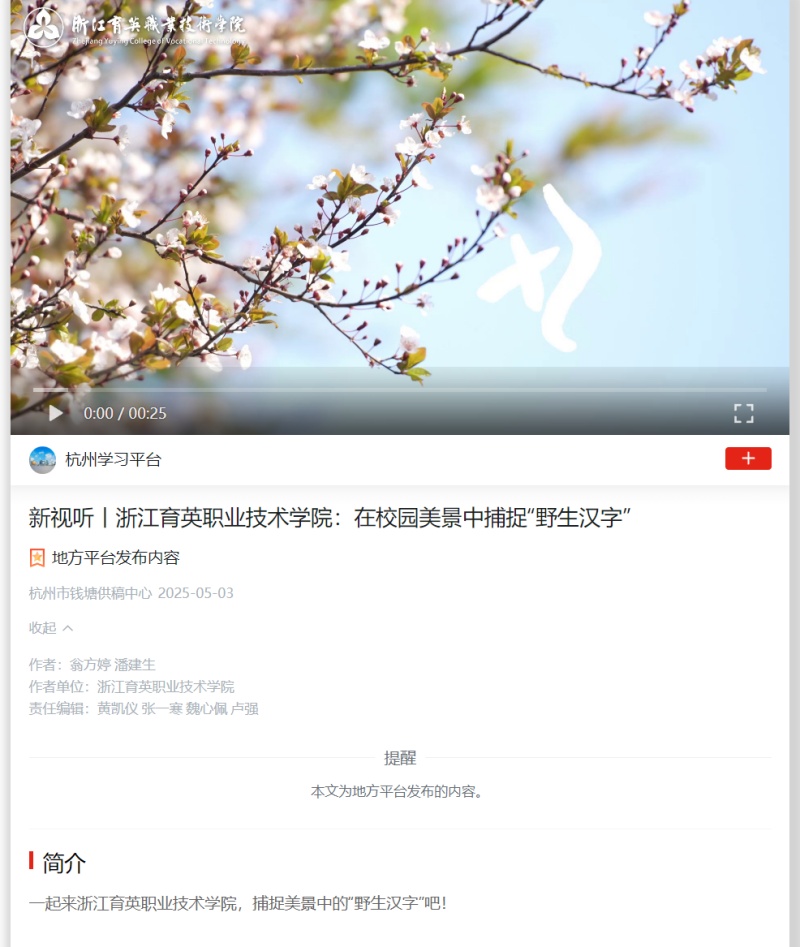 媒体看育英 联系我们 地址:杭州市钱塘区4号大街16号 邮编:310018 电话:0571-86911032、86877189 媒体看育英 当前位置:首页 >> 媒体看育英 【学习强国】新视听丨浙江育英职业技术学院:在校园美景中捕捉“野生汉字” 时间:2025-05-08