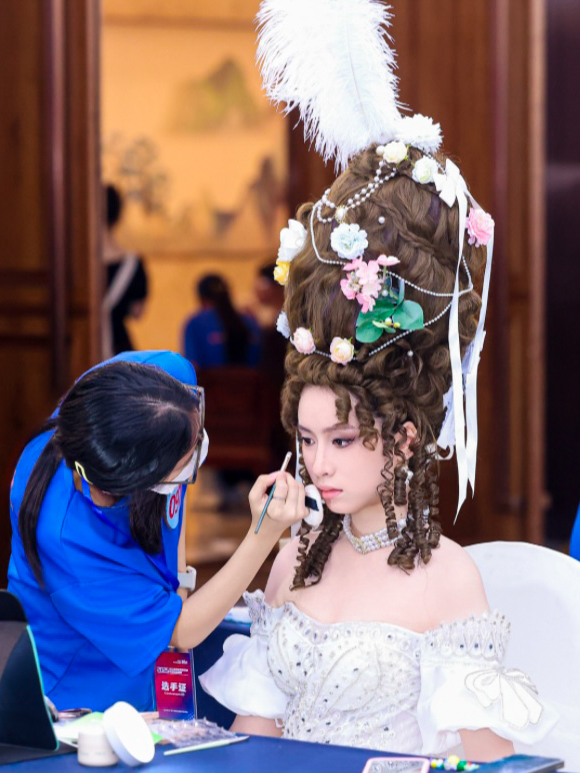 在创意新娘组激烈的比拼中,孙楚艺的作品《洛可可新娘》斩获了一等奖。该作品将18世纪洛可可风格解构重组,高盘发搭配蝴蝶结、蕾丝元素与不对称剪裁,塑造出独立摩登又浪漫的新时代女性形象。为呈现洛可可风格的精准比例,她多次调整发髻高度与装饰位置,追求最好的风貌展现。