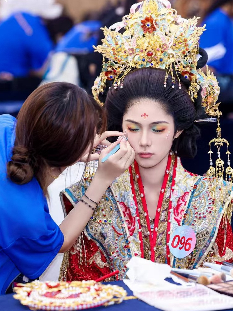 国风造型组一等奖获得者闻艳的作品融合传统与现代风格,将饱满发髻与金钗、花钿搭配,红色眼影点缀其间,让古典韵味与现代美妆艺术碰撞出独特魅力,获得评委高度认可。“为还原唐朝风韵,我查阅了不少古籍画册,备赛时放弃课余休息苦练技术,感谢老师的悉心指导和模特的陪伴与配合。这段经历让我懂得了‘匠心’就是在重复中不断追求卓越。”闻艳说。