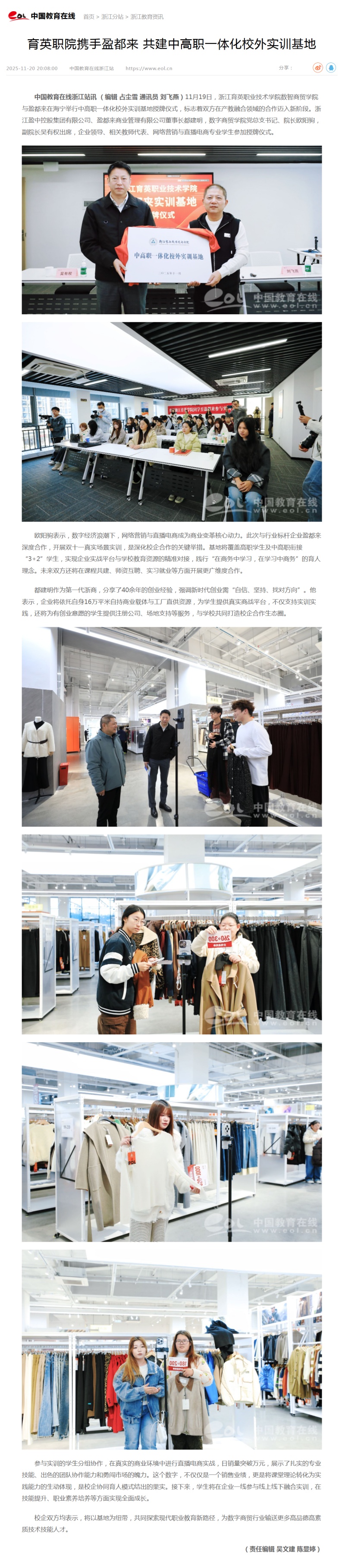 星空国际游戏厅浙江站讯 (编辑 占尘雪 通讯员 刘飞燕)11月19日,浙江育英职业技术学院数智商贸学院与盈都来在海宁举行中高职一体化校外实训基地授牌仪式,标志着双方在产教融合领域的合作迈入新阶段。浙江盈中控股集团有限公司、盈都来商业管理有限公司董事长都建明,数字商贸学院党总支书记、院长欧阳驹,副院长吴有权出席,企业领导、相关教师代表、网络营销与直播电商专业学生参加授牌仪式。