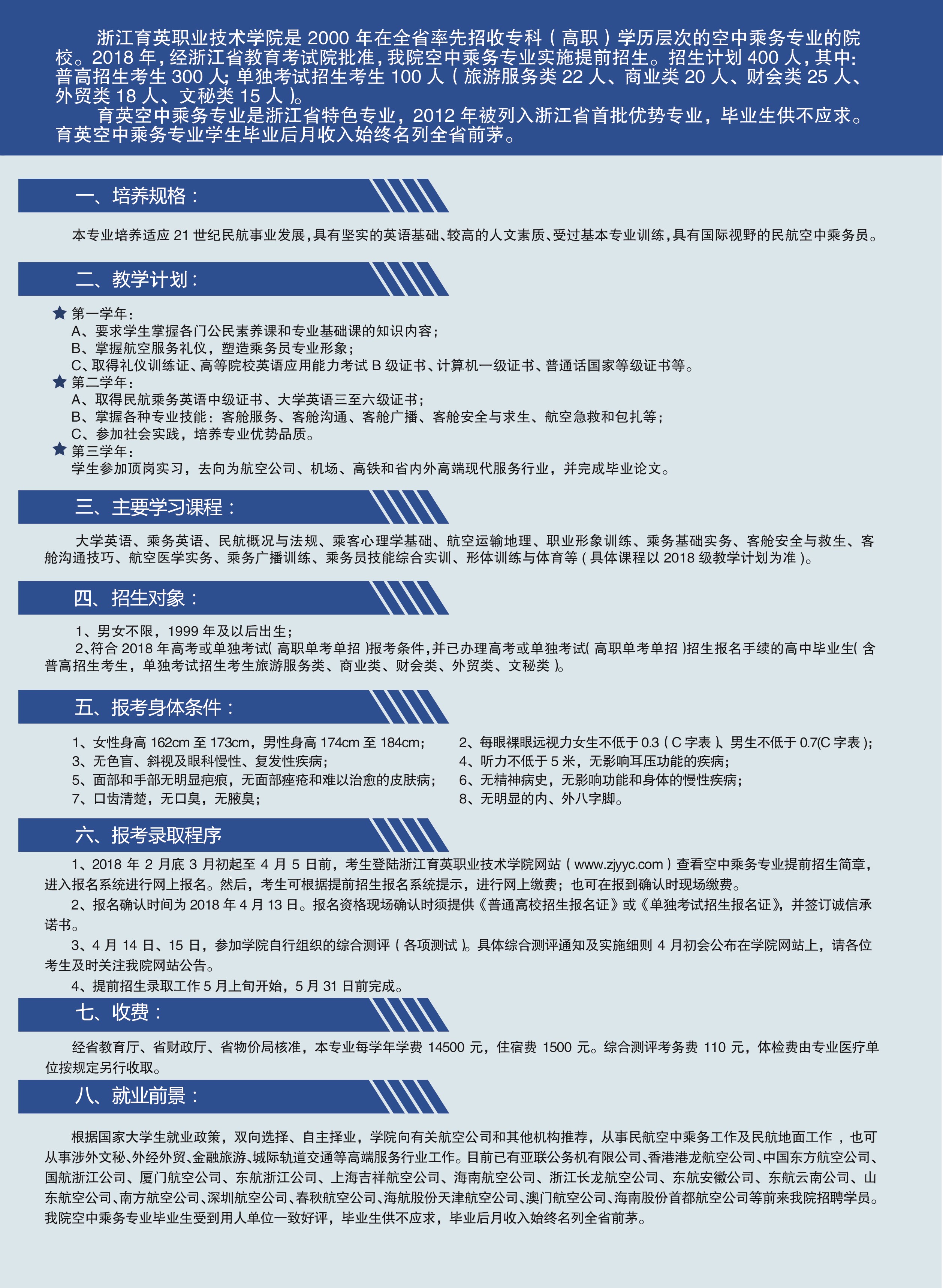 招生咨询 招生公告 报考指南 提前招生 历年分数 2025年招生专栏 录取查询 在线咨询 联系我们 地址:杭州市钱塘区4号大街16号 邮编:310018 电话:0571-86911032、86877189 报考指南 当前位置:首页 >> 招生咨询 >> 报考指南 我院2018年空中乘务专业提前招生简单(彩页) 时间:2018-02-28 各位考生:欢迎你们报考浙江育英职业技术学院空中乘务专业,报名前请仔细阅读我院提前招生简章,看清是否满足报名条件,报名时个人信息务必填写准确。 点击进入报名界面 缴费方式:报名信息审核通过后,可以通过我院官网公告发布的链接进行网上缴费。 点击进入缴费界面。
