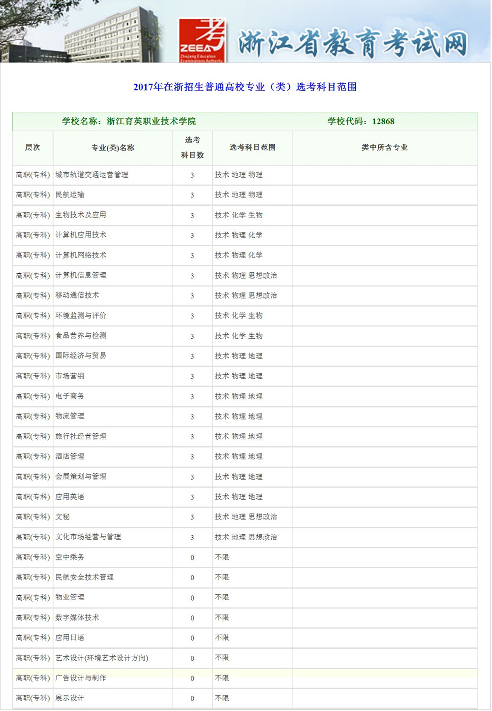 招生咨询 招生公告 报考指南 提前招生 历年分数 2025年招生专栏 录取查询 在线咨询 联系我们 地址:杭州市钱塘区4号大街16号 邮编:310018 电话:0571-86911032、86877189 报考指南 当前位置:首页 >> 招生咨询 >> 报考指南 学院2017年在浙招生普通高校专业(类)选考科目范围 时间:2017-01-17