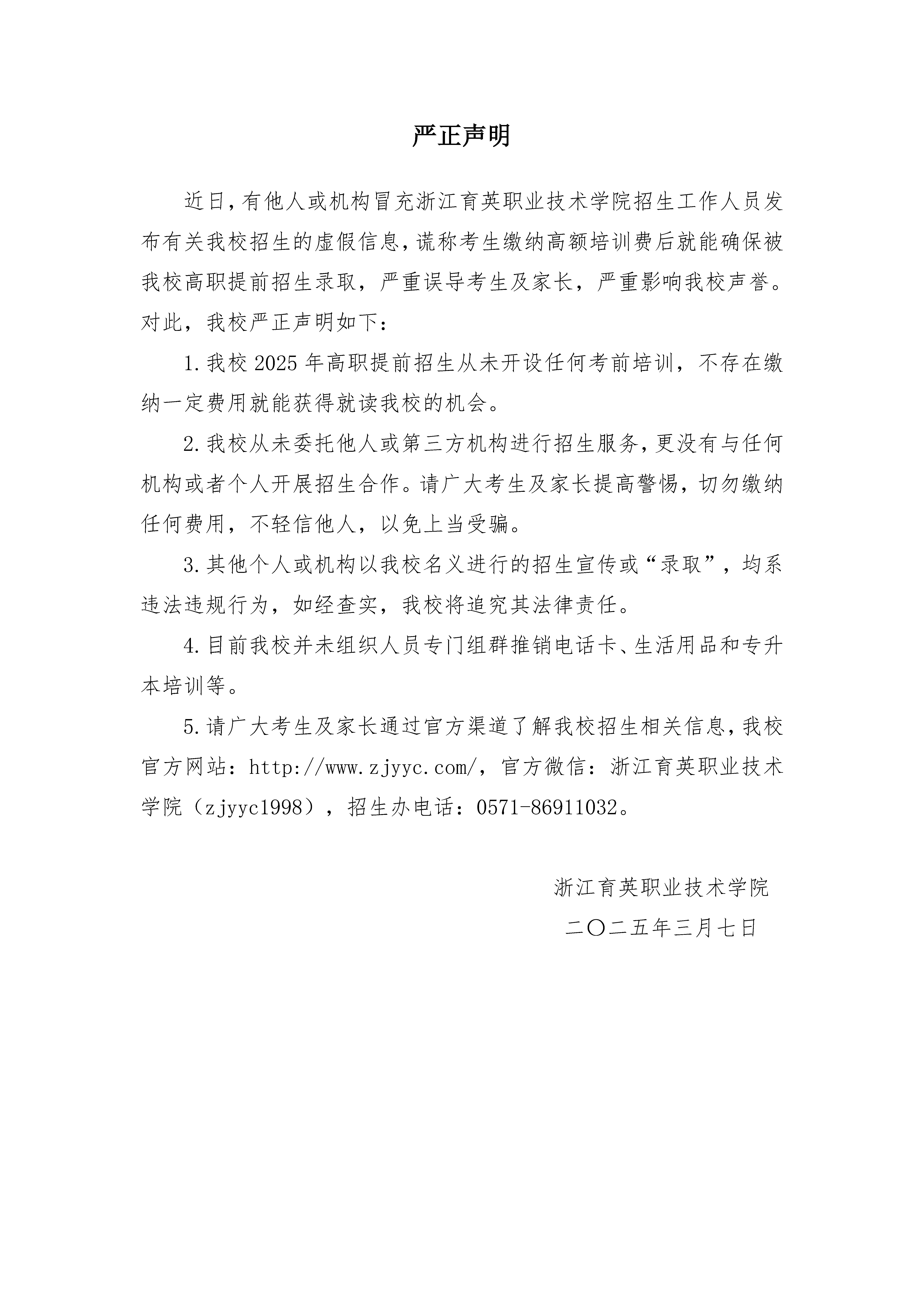 招生咨询 招生公告 报考指南 提前招生 历年分数 2025年招生专栏 录取查询 在线咨询 联系我们 地址:杭州市钱塘区4号大街16号 邮编:310018 电话:0571-86911032、86877189 招生公告 当前位置:首页 >> 招生咨询 >> 招生公告 严正声明 时间:2025-03-07