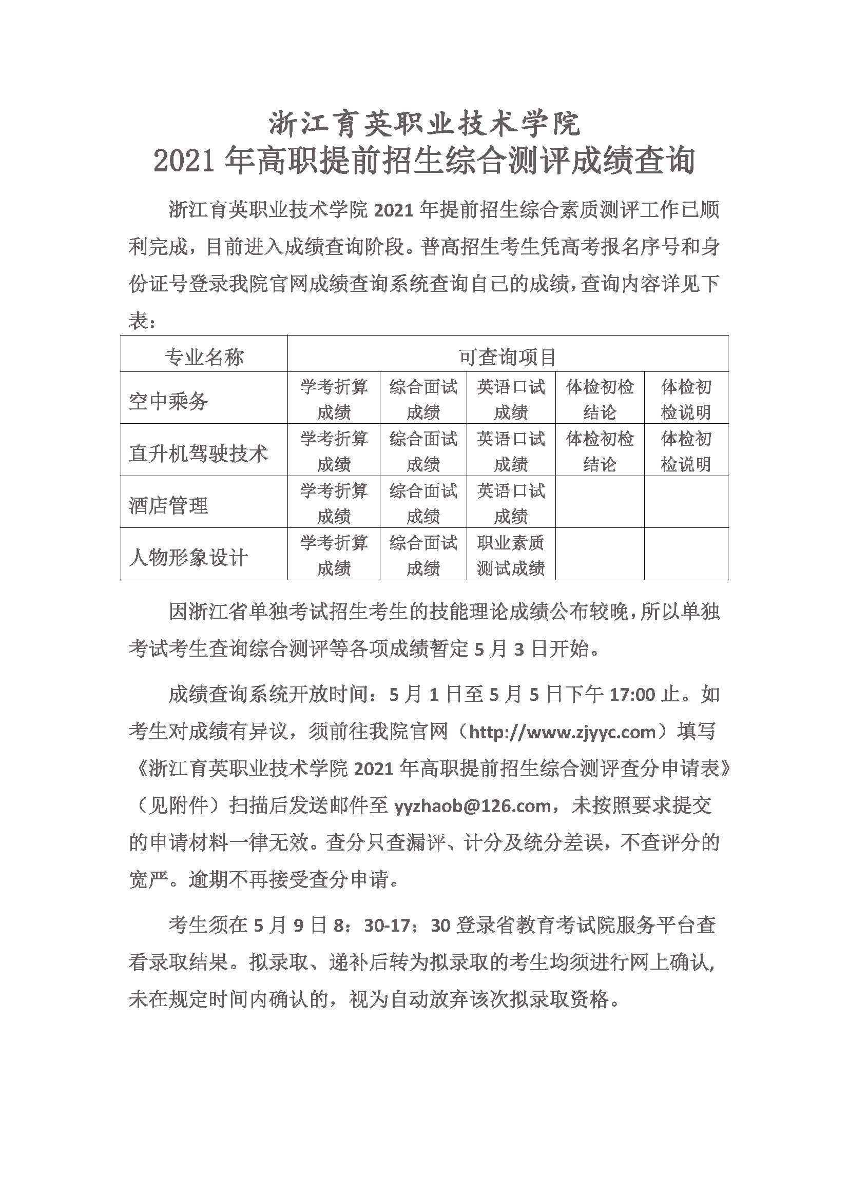 浙江育英职业技术学院2021年高职提前招生综合测评成绩查询
