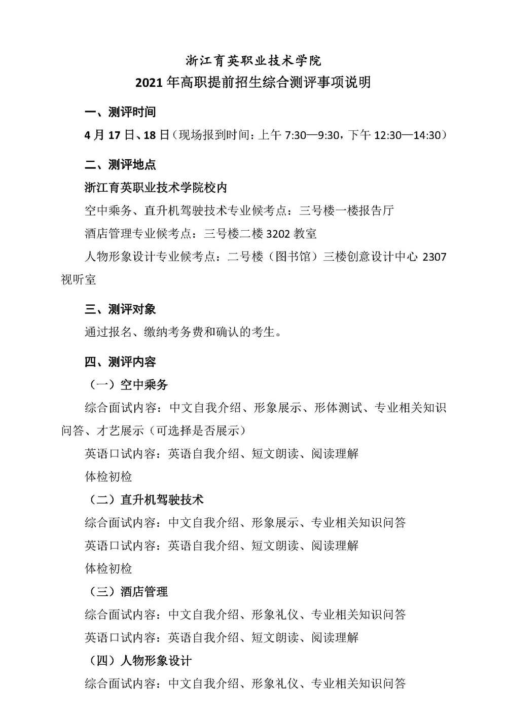 招生咨询 招生公告 报考指南 提前招生 历年分数 2025年招生专栏 录取查询 在线咨询 联系我们 地址:杭州市钱塘区4号大街16号 邮编:310018 电话:0571-86911032、86877189 招生公告 当前位置:首页 >> 招生咨询 >> 招生公告 浙江育英职业技术学院2021年高职提前招生综合测评事项说明 时间:2021-04-11