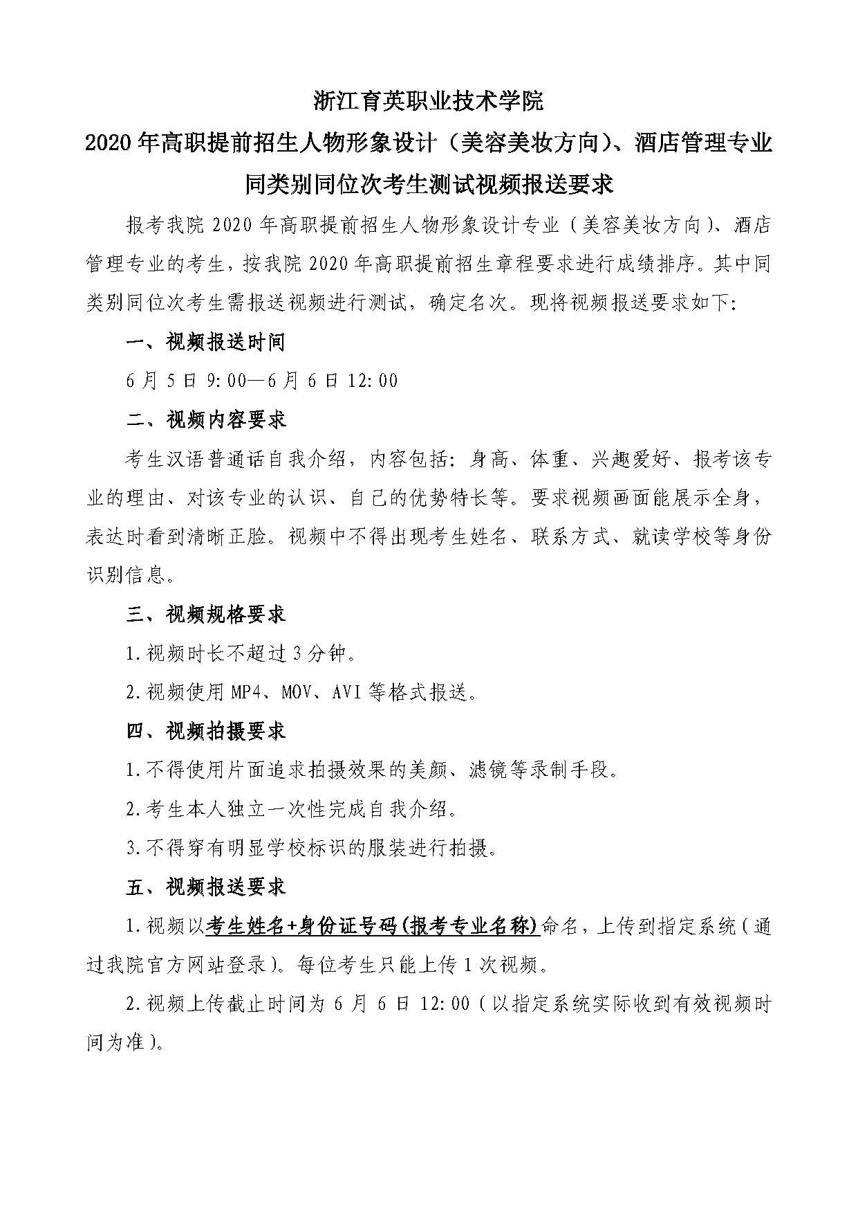 2020年高职提前招生人物形象设计专业、酒店管理专业同类别同位次考生测试视频报送要求