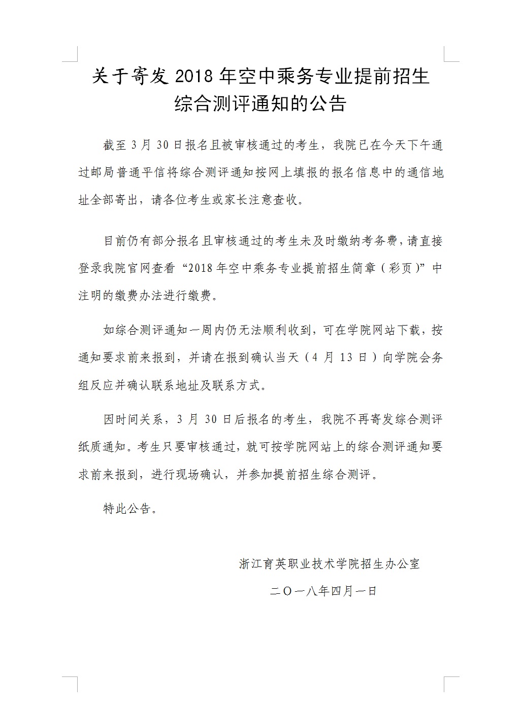 关于寄发2018年空中乘务专业提前招生综合测评通知的公告