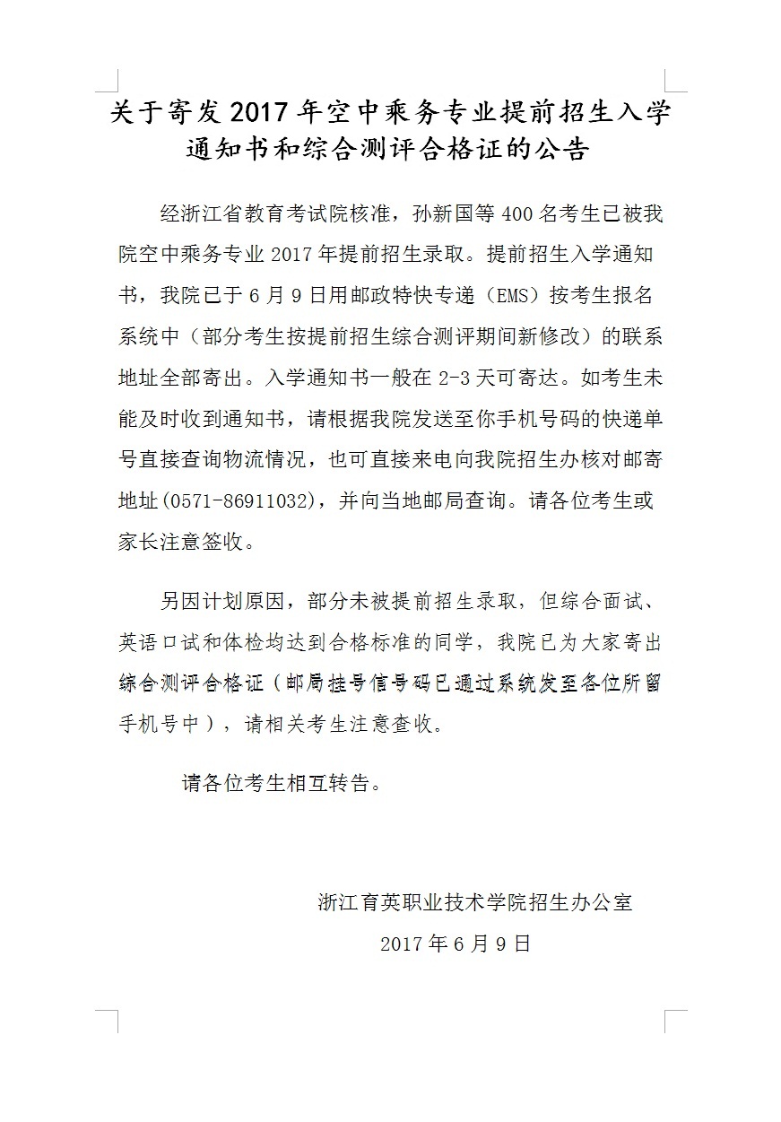 招生咨询 招生公告 报考指南 提前招生 历年分数 2025年招生专栏 录取查询 在线咨询 联系我们 地址:杭州市钱塘区4号大街16号 邮编:310018 电话:0571-86911032、86877189 招生公告 当前位置:首页 >> 招生咨询 >> 招生公告 关于寄发2017年空中乘务专业提前招生入学通知书和综合测评合格证的公告 时间:2017-06-09