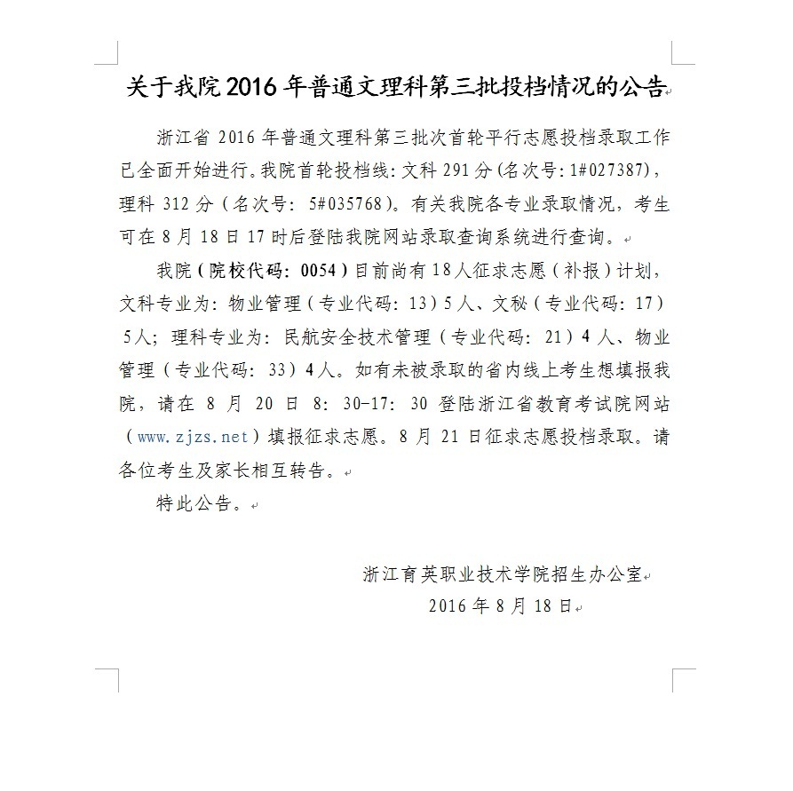 招生咨询 招生公告 报考指南 提前招生 历年分数 2025年招生专栏 录取查询 在线咨询 联系我们 地址:杭州市钱塘区4号大街16号 邮编:310018 电话:0571-86911032、86877189 招生公告 当前位置:首页 >> 招生咨询 >> 招生公告 关于我院2016年普通文理科第三批投档情况的公告 时间:2016-08-18