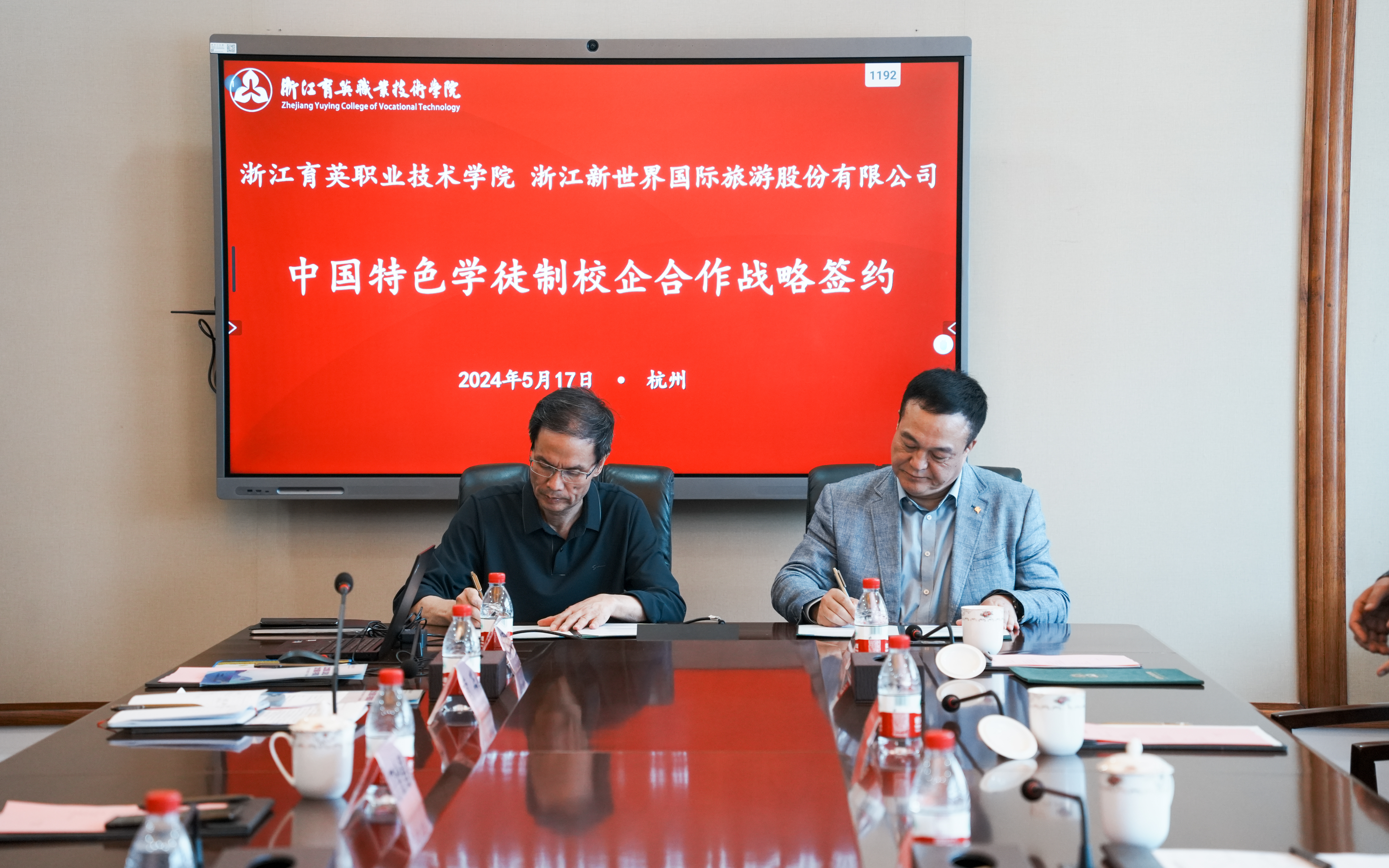 5月17日,浙江育英职业技术学院与浙江新世界国际旅游股份有限公司、杭州市西湖游船有限公司“中国特色学徒制”校企合作战略签约在学校九楼会议室举行。