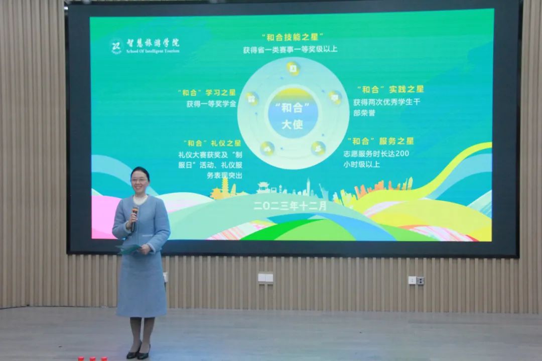学院党总支书记、院长黄华解读“和合”大使评选标准,在学习、技能、实践、服务、礼仪等方面取得相应成绩,学院授予“和合”大使荣誉。学院通过评选“和合”大使活动,希望同学们能把“责任担当、大爱奉献、顽强拼搏”的育英“三种精神”转为为自觉的追求。