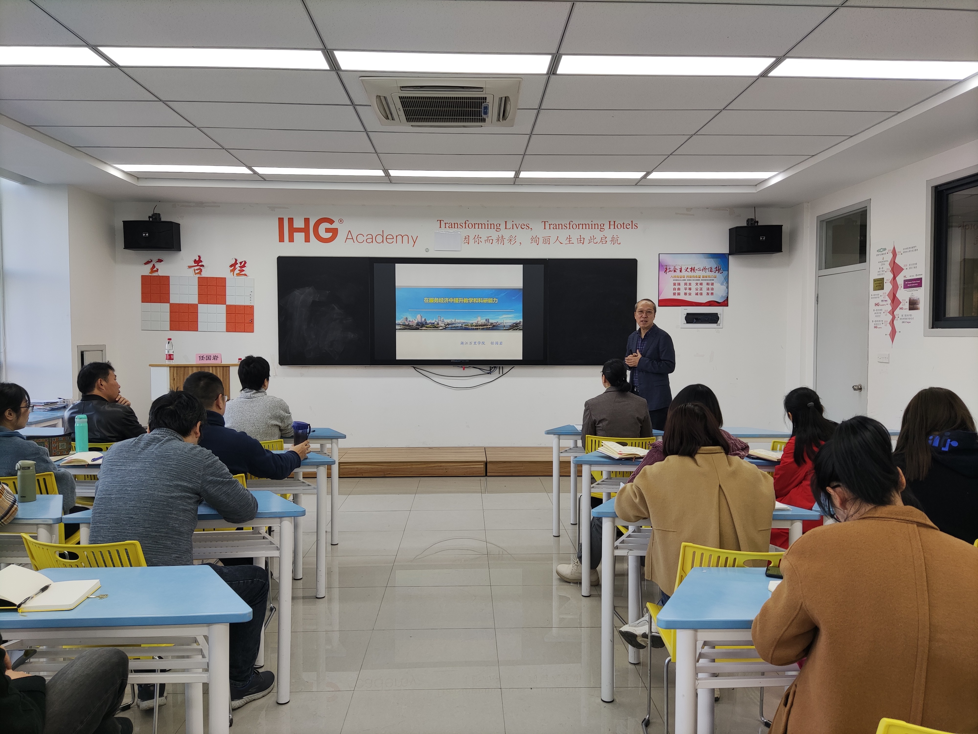 任国岩教授表示,能受聘育英学院特聘教授感到十分荣幸,同时感到责任重大。在今后的工作中将进一步结合自身研究方向,利用自身的资源和优势为学校的发展贡献自己的力量。当日,任国岩教授为智慧旅游分院全体教师做了题为《在服务经济中提升教学和科研能力》的讲座。整个讲座从高等教育主要任务及关系;旅游学科的科研与服务经济;常用的旅游会展研究文稿;研究工作的三个方向;规划写作的基本架构;会展文稿写作的基础与提升这六方面详细讲授,为分院全体教师明晰了如何提升科研质量的方法和路径,大家受益匪浅。