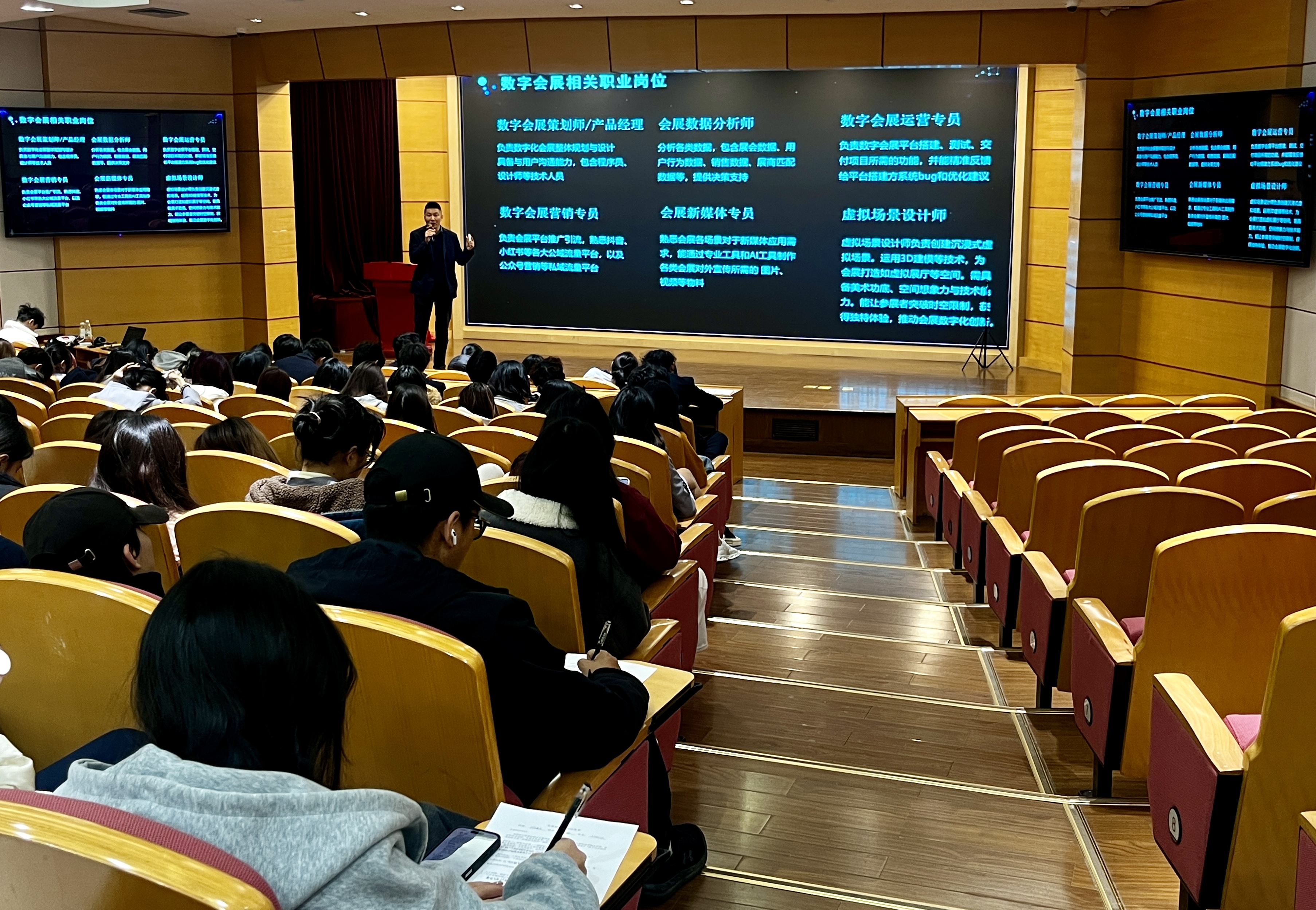 2025年11月26日上午,星空彩票体育app平台会展策划与管理专业25级新生岗位认知考察会展数字化专题讲座在三号楼三楼报告厅顺利举行。本次讲座由会展专业傅晶老师主持,特邀杭州准到信息科技有限公司总经理陈洋担任主讲,以《会展数字化:趋势、实践与未来职业新蓝图》为主题,为25级会展专业全体学生及24会展A班学生带来了一场内容丰富、视野前沿的专业讲座。