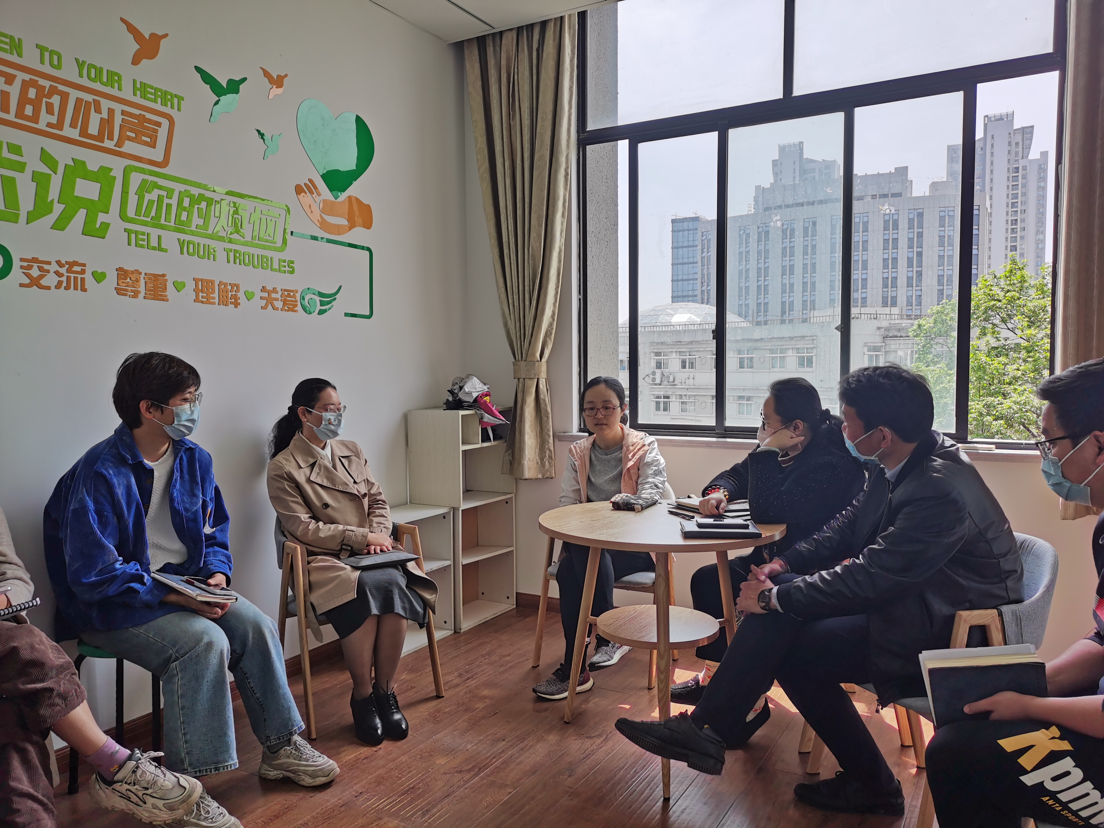 除心理问题学生之外,本次会议还就新成立的谈心谈话室布置问题,咨询了心辅中心的意见。刘宁宁老师提出:由于谈心谈话室位处较高,为防止意外,需将窗户开合程度做出限制;在未来需要谈心谈话的时候,为保护学生心理状态,不要将学生单独留在谈话室内;特殊情况下,尤其是女老师在谈话过程中,有必要请另一名班主任在门口帮忙协助等专业意见。
