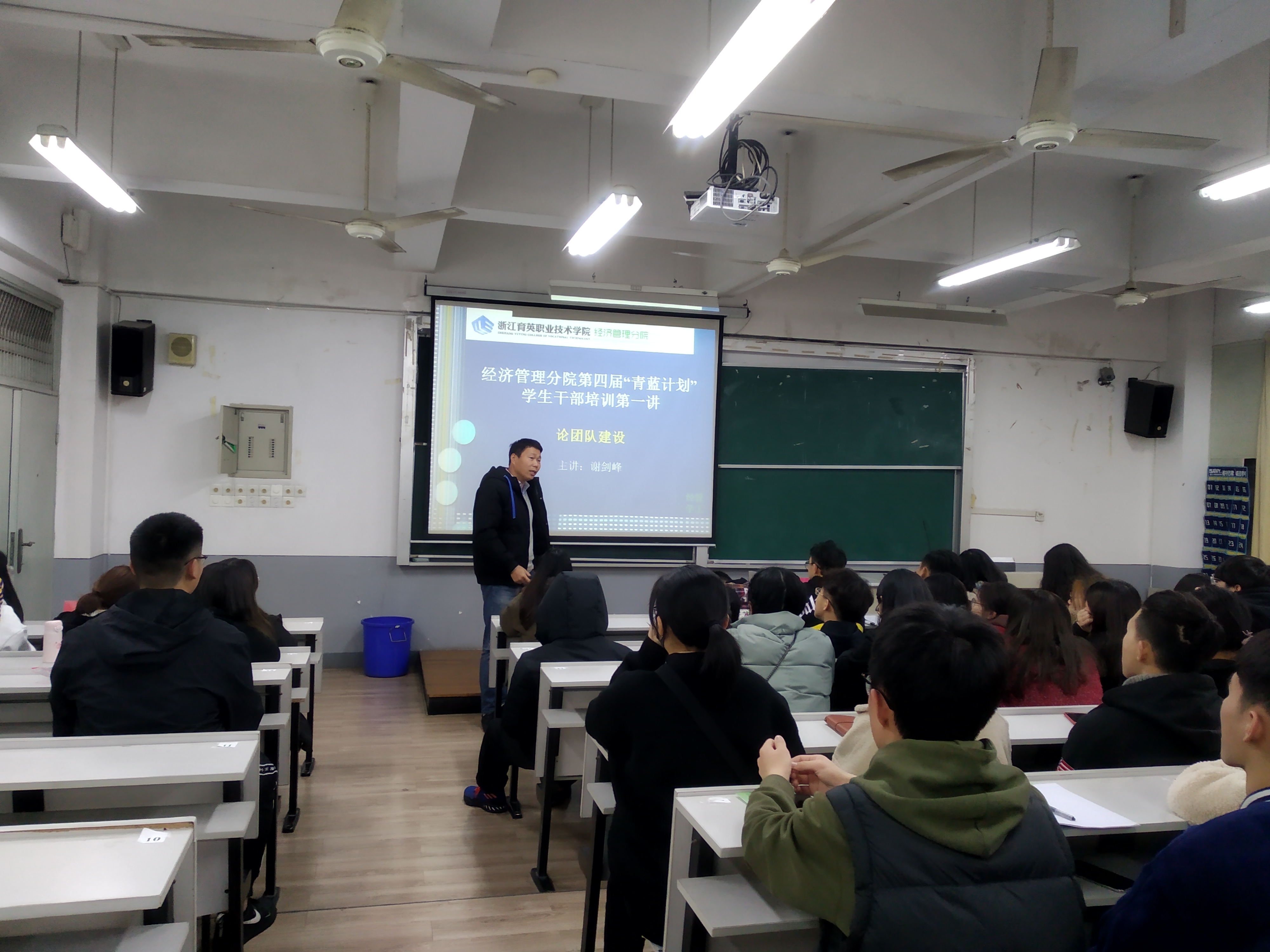 124经济管理分院第四届“青蓝计划”学生干部培训正式开班。经济管理分院党总支部书记谢剑峰,团总支部书记杨梦乐老师,辅导员翁蕾老师、张钦威老师,18级学生干部代表以及19级学生干部代表参加了此次开班典礼