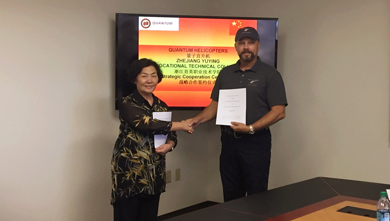 9月27日,赴美考察小组成员与量子直升机航校校长、总飞行师及中方总负责人召开洽谈会。会上播放了杭州市宣传片、学院宣传片和直升机专业宣传片。赵院长介绍了我院直升机专业的发展概况,表达了希望展开深度合作的愿望。航校校长尼尔先生高度重视本次合作,对赵院长一行表示欢迎,并承诺在未来尽全力为直升机专业提供必要的服务和支持。最终双方达成一致,签订了合作协议。