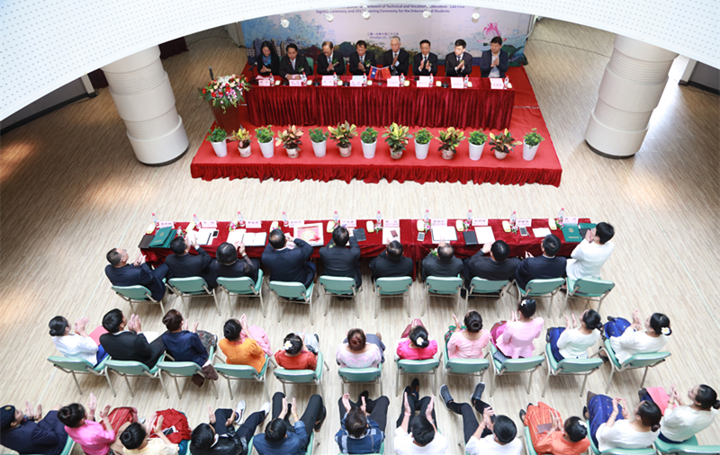 本朋和盛健分别代表老挝教育与体育部职业技术教育司和浙江育英职业技术学院签订合作备忘录。