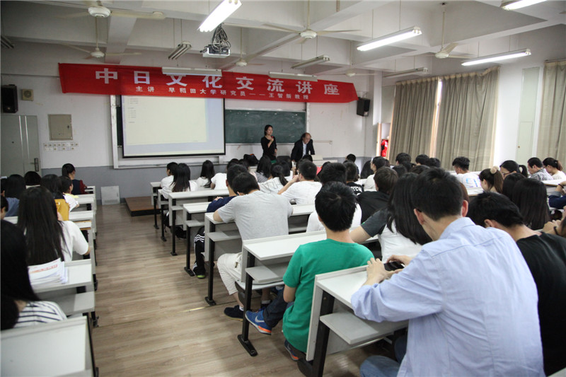 会谈结束后,王智新教授应邀在1315教室做了题为“中日文化交流”的专题讲座,应用日语专业一、二年级学生和应用日语教研室全体老师参加了此次讲座。