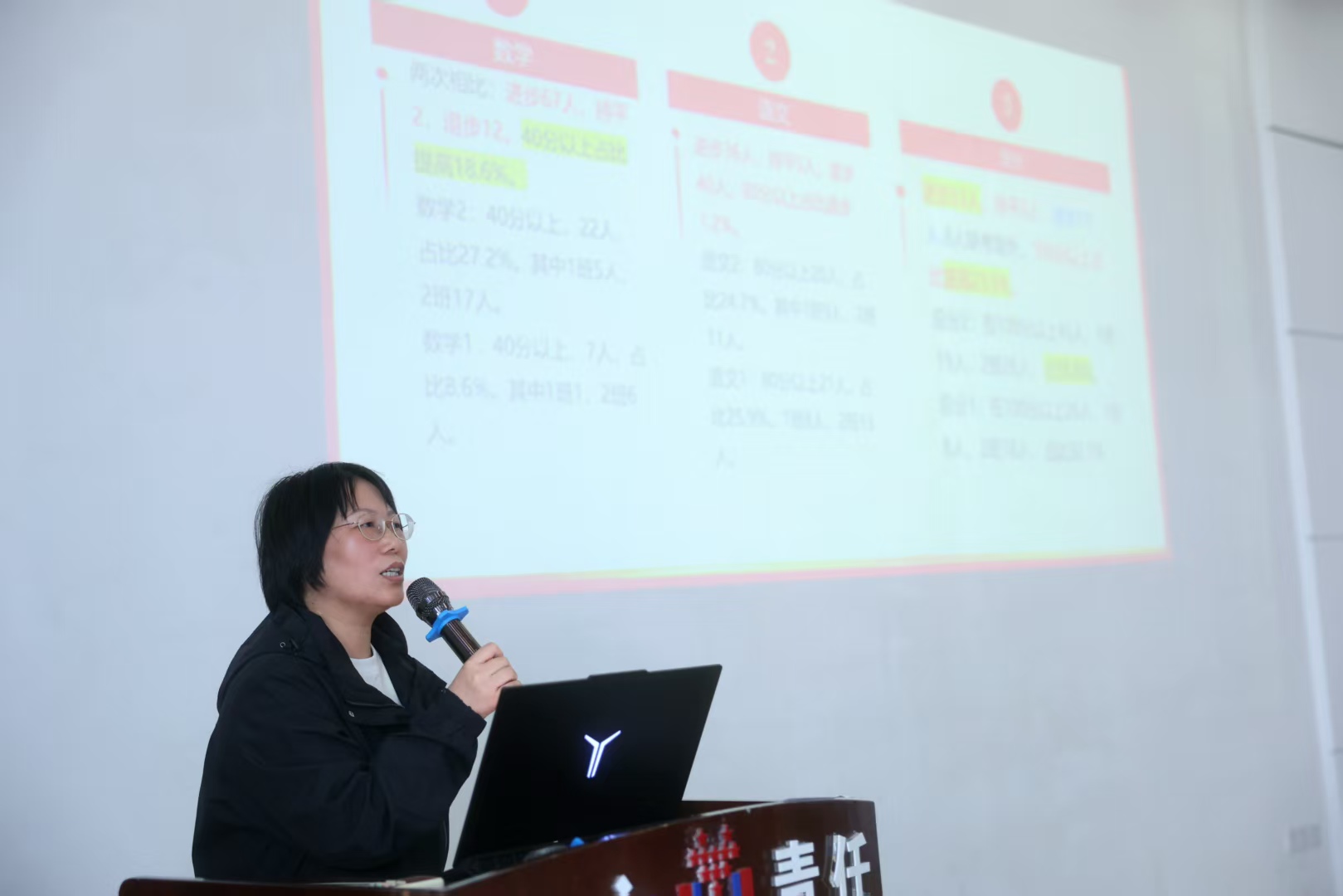 随后,**教务办主任王卫平老师**对本次月考进行了全面而深入的总结。她运用详实的数据,客观展示了班级整体及各科的进步情况,在肯定成绩的同时,也精准指出了存在的共性问题。王主任再次明确了单招单考的终极目标,并特别针对即将到来的 **11月份技能实操考试** ,向全体考生发出了 **“必过”** 的动员令。她要求同学们务必合理规划复习进度,注重理论与实践的结合,以积极饱满的状态和从容平和的心态,迎接挑战,决胜考场。这番讲话既有宏观指引,又有微观要求,为同学们下一阶段的复习备考指明了方向。