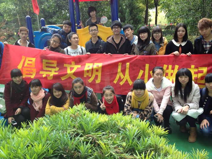 在园长的协调下,我们分成了三组,分别“进驻”大班、小班、小小班。我们和小朋友们做游戏,在游戏的过程中渗透文明礼仪教育;我们教小朋友们叠被子,教会他们爱护自己“小小的寝室”;我们陪小朋友们吃中饭,教育他们要爱惜粮食,不能挑食……活动中,小朋友们银铃般的笑声也给我们带来了无限欢乐。最后,我们举行签字合影仪式,同学们纷纷表示要在今后的学习和生活中把文明之风散播到每一个角落,从身边做起,从小事做起。