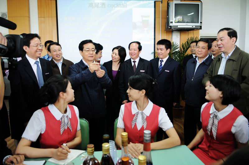 当赵洪祝书记一行走进空中乘务实训中心时,学生们正在上实训课调制鸡尾酒,客人们立刻被师生们富有飞机上真实场景的技能教学吸引住了,他们驻足观看学生们正在制作的色泽晶莹的杯中物,饶有兴趣地听取分院院长的介绍,并兴致勃勃地品尝了学生现场调制的鸡尾酒,对学生的“手艺”连声称赞。随后,赵洪祝书记一行又走进模拟机舱“育英号”,参观了机舱内的情境教学。当听说育英学院空中乘务专业开办已近10年,已有200多名学子飞上蓝天时,赵洪祝书记高兴地说,下次乘机,先问问服务员是否育英毕业的,希望育英学子飞天的越来越多。