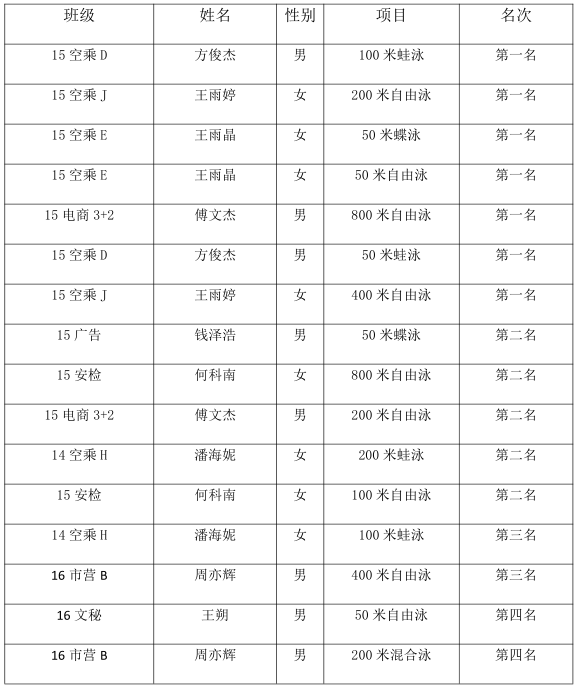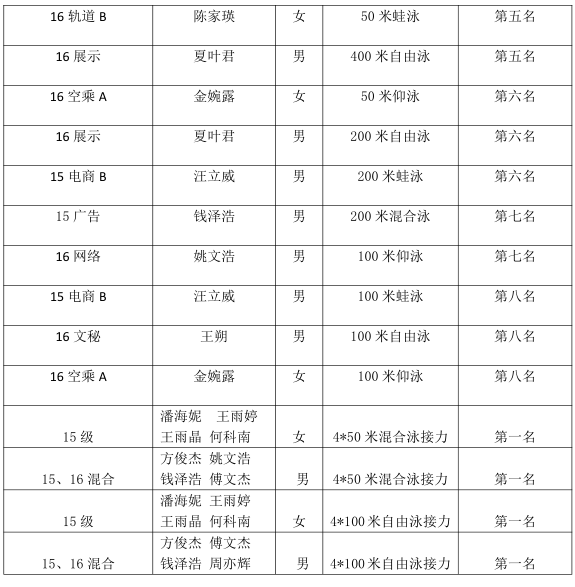 2017年5月19日-20日,由浙江省教育厅、浙江省体育局主办的2017年浙江省大学生游泳锦标赛在浙江财经大学举行,由季勋龙领队,赵佳子,楼俊毅,黄中华三名教练指导,我院游泳健儿精神饱满,奋勇拼搏,经过激烈的角逐,获得了优异的成绩,为11金5银2铜,荣获男团、总团冠军、女团第二的成绩,学院获体育道德风尚奖的荣誉称号。楼俊毅教练获得优秀教练员称号,潘海妮、方俊杰获得优秀运动员称号。具体成绩如下: