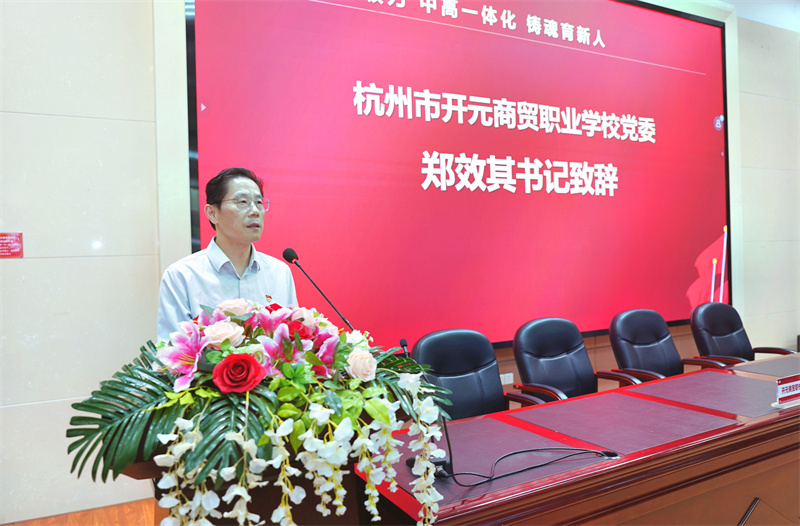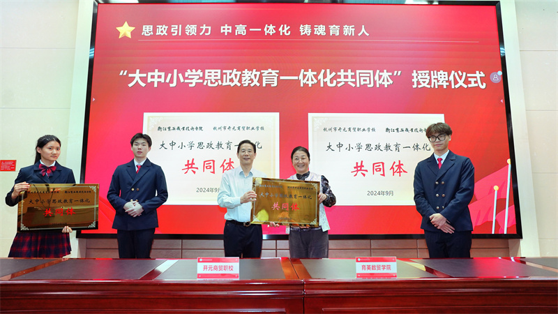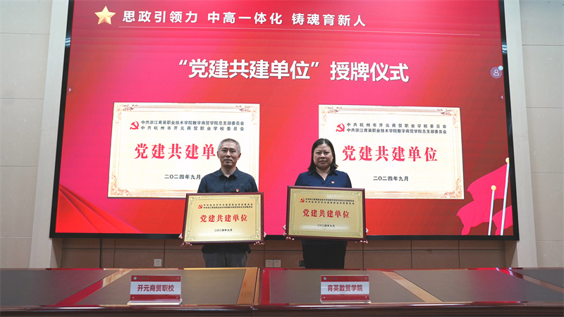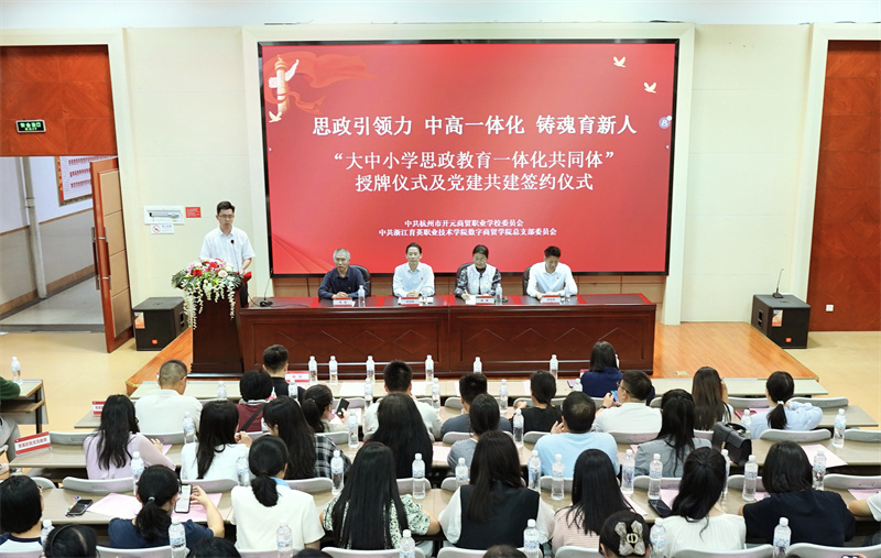 9月25日,浙江育英职业技术学院数字商贸学院与杭州市开元商贸职业学校共建“大中小学思政教育一体化共同体”授牌仪式暨党建共建签约仪式在开元商贸职校长德校区举行。