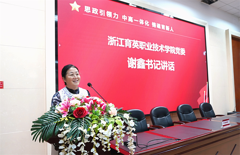谢鑫发表讲话。她说,党和国家历来高度重视学校思想政治教育,围绕“培养什么人、怎样培养人、为谁培养人”这个根本问题,着力强调一体化协同育人。从统筹推进大中小学思政课一体化建设、推动“大思政课”建设,再到深入推进大中小学思想政治教育一体化建设,为新时代新征程上两校共同推进思想政治教育高质量发展、深入推进两校中高职人才贯通培养指明了前进方向。育英学院和开元商贸职校有10多年的合作历史,共同培养了近700名高素质职业人才。党建工作做实了就是发展力,做强了就是生命力,做深了就是凝聚力。两校将以此次党建共建为新起点,通过组织联建、人才联育、资源联享、载体联创等,实现优势互补、资源共享,持续深化中高职人才培养,拓展大中小学思政教育一体化新途径,赋能学校发展、教师发展和学生发展,最终实现合作共赢。