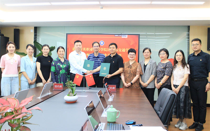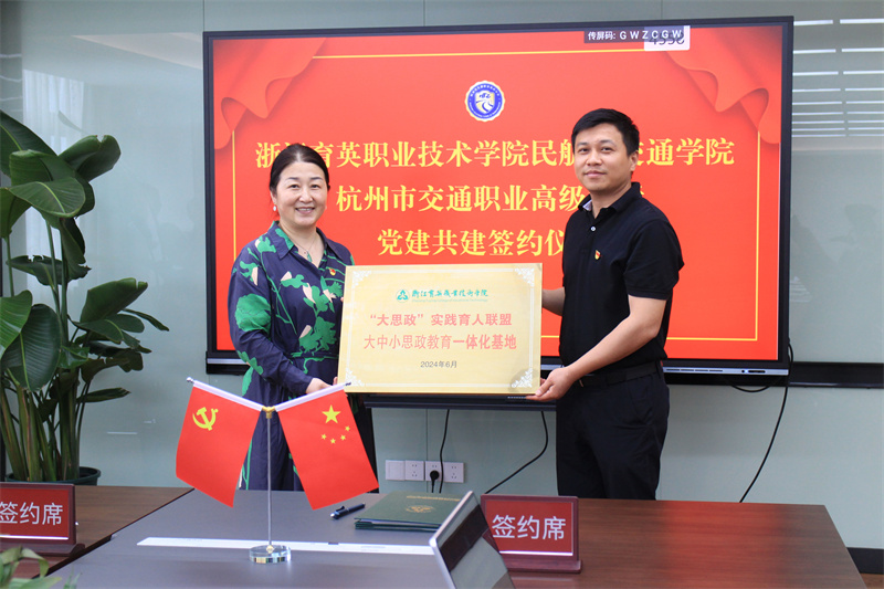 6 月13日上午,浙江育英职业技术学院民航交通学院与杭州市交通职业高级中学举行中高职党建共建签约暨大中小学思政教育一体化实践教学基地揭牌仪式在交通职高举行。育英学院校长丁金昌,党委书记、副校长谢鑫,副校长徐晓斌,民航交通学院党总支副书记、副院长赵瑞晔,副院长韩丽,交通职高校长金宏,党总支部书记祁长伟,副校长周岚等出席签约仪式。