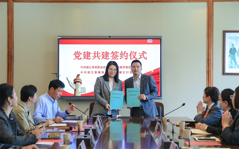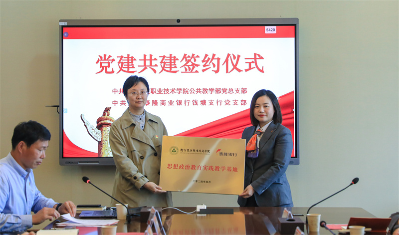 4月2日下午,浙江育英职业技术学院公共教学部、浙江泰隆商业银行钱塘支行、白杨街道云水社区“校企地党建共建暨大中小学红色教育一体化联建基地”签约与揭牌仪式在我校举行。我校党委书记、副校长谢鑫,白杨街道云水社区党支部书记孙桂英,泰隆银行杭州分行党委委员、分行副行长陶丽红及杭州分行钱塘支行行长蒋生火、副行长胡伦娜等,我校党委委员、党群部主任王贤军,公共教学部党总支书记、主任、马克思主义学院院长陈贤平,思政课教师代表出席仪式。公共教学部党总支副书记、副主任谢剑峰主持会议。