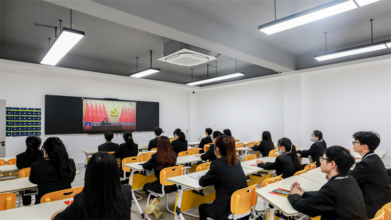 学校党委理论学习中心组全体成员、教师党员干部、专任教师、后勤职工、学生党员干部、学生社团会员、党章学习小组成员、入党积极分子等,分别在会议室、党员活动室、书吧、教室、寝室等场所收看。